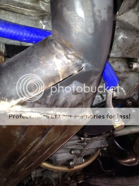 If it were me, to be safe, I'd remove. The last thing you need are loose welding "particles" flowing thru the turbo. This way you can run a chain of some sort thru the pipes to knock of potentially loose metal from the welding process....