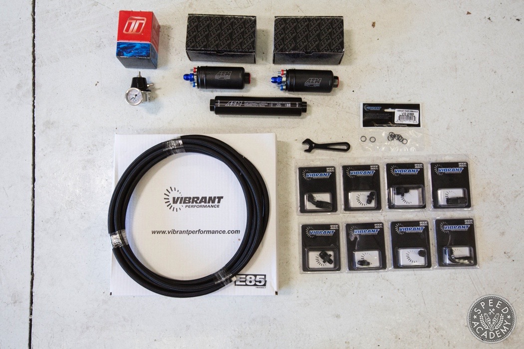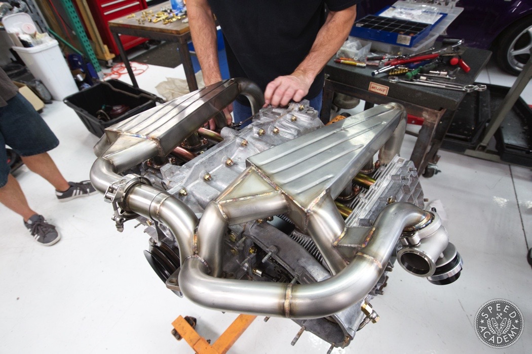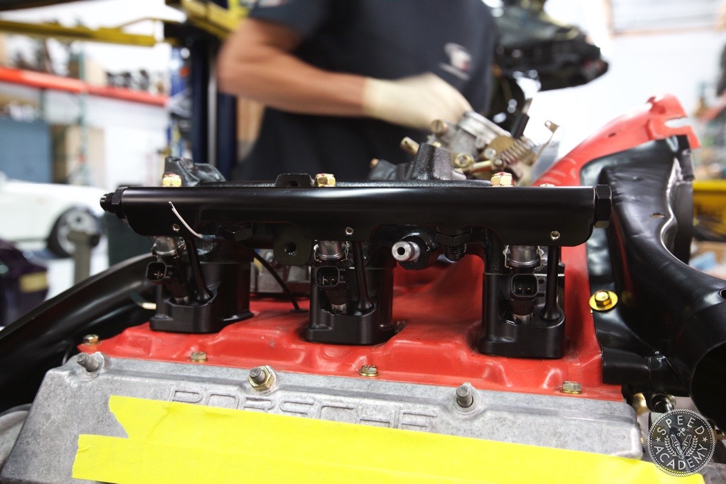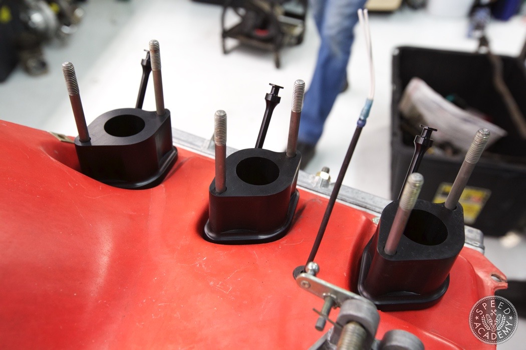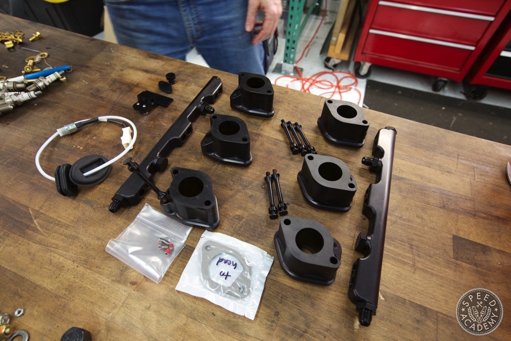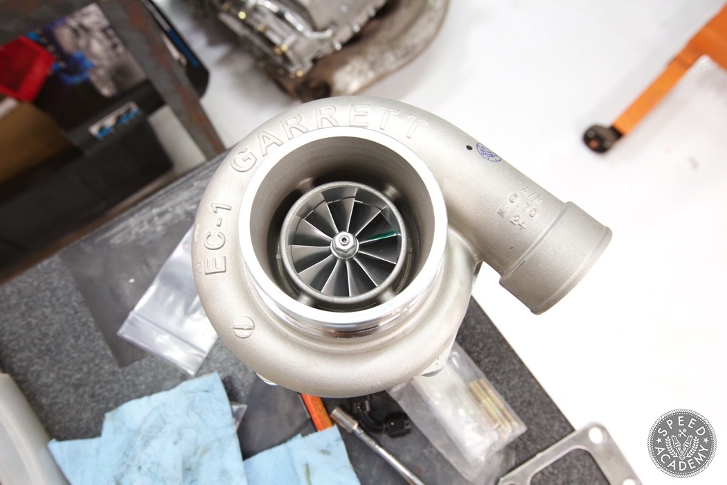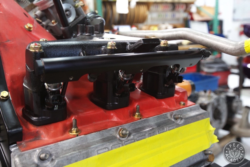 http://speed.academy/wp-content/uplo...-turbo-033.jpg http://speed.academy/wp-content/uplo...-turbo-034.jpg Another mod that needs to be done in order to run EFI is the throttle body needs a TPS. No problem, Chris has the solution for that with a new shaft and additional fitting on the side of the TB. http://speed.academy/wp-content/uplo...-turbo-035.jpg The TurboKraft fuel lines and injector blocks fit up so well along side my manifold that I painted black. I'm running ID1000 injectors in case you're wondering. http://speed.academy/wp-content/uplo...-turbo-037.jpg http://speed.academy/wp-content/uplo...-turbo-039.jpg Here's just a cool shot from below. :) http://speed.academy/wp-content/uplo...-turbo-038.jpg I'm going to be running a Garrett GTX 3582R as my turbo but we're installed a smaller GRTX 3076R turbo first to see how it does. Odds are the turbo is too small but this back to back test will provide real world results as to why or why not. http://speed.academy/wp-content/uplo...-turbo-040.jpg http://speed.academy/wp-content/uplo...-turbo-041.jpg Mike got as far as installing the wiring harness, FPR, TB and fuel lines before we ended today. I'm so excited to see this motor finally coming together. It's just a shame that we've been waiting for parts for many days now because this build would be further along but that's the nature of the business I'm finding. I've never been patient with shops but now I get why there are so many delays. They can't control when parts arrive and when they're on back order. Still though, I'm happy we've come as far as we have in the time frame. I need to get home soon but will be hanging out until we're done here! http://speed.academy/wp-content/uplo...-turbo-043.jpg |