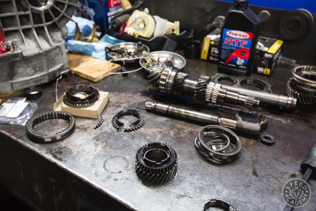 A good friend of mine, Tony at UMS Tuning used to rebuild 930 transmissions so he graciously offered to rebuild mine while I watched. The 4 speed is actually not as complex as I expected and Tony had it torn apart in a few hours. http://speed.academy/wp-content/uplo...-turbo-009.jpg After some inspection, my 2nd and 3rd gear dog rings were worn out as well as the sliders. I also bought 4 new synchros since it just made sense to replace them all while everything is apart. If you look closely you can see one of the dog rings cut in pieces. It was a massive pain in the ass to remove it, requiring a cutting disk and plenty of cursing and swearing. Tony spent over an hour removing both gears! http://speed.academy/wp-content/uplo...-turbo-023.jpg I'll have a full video documenting the process done in a few weeks but in the meantime I'll post any other photos of the rebuild once we complete it. http://speed.academy/wp-content/uplo...-turbo-024.jpg |