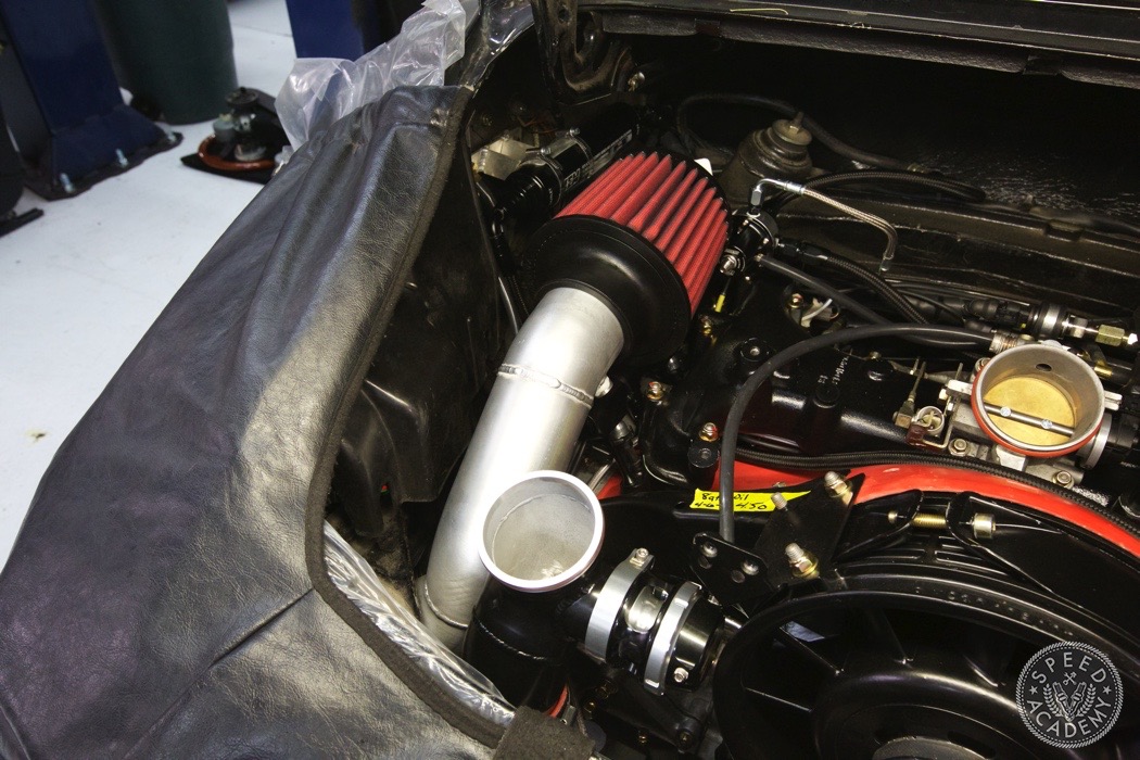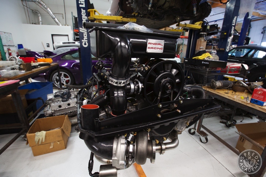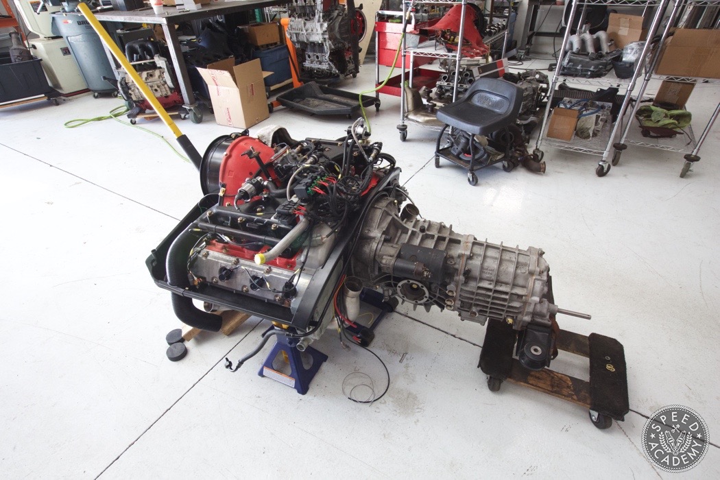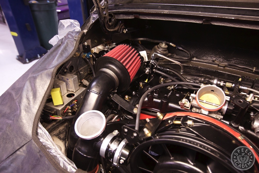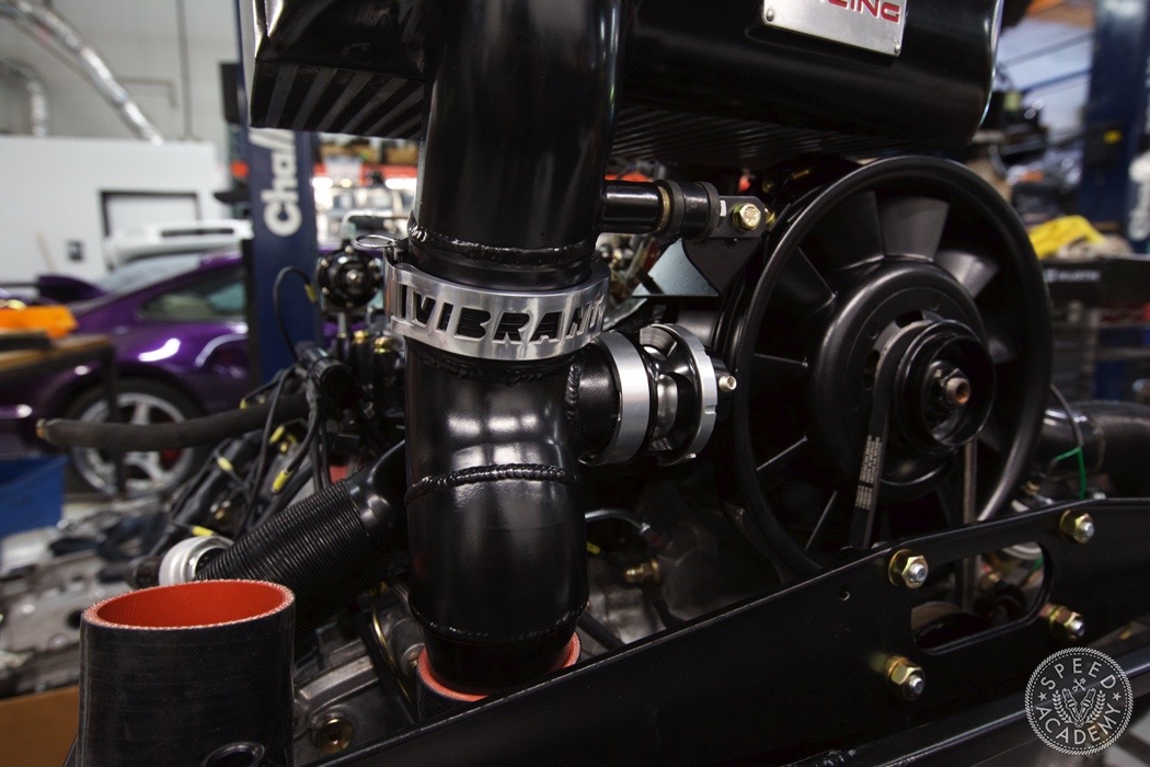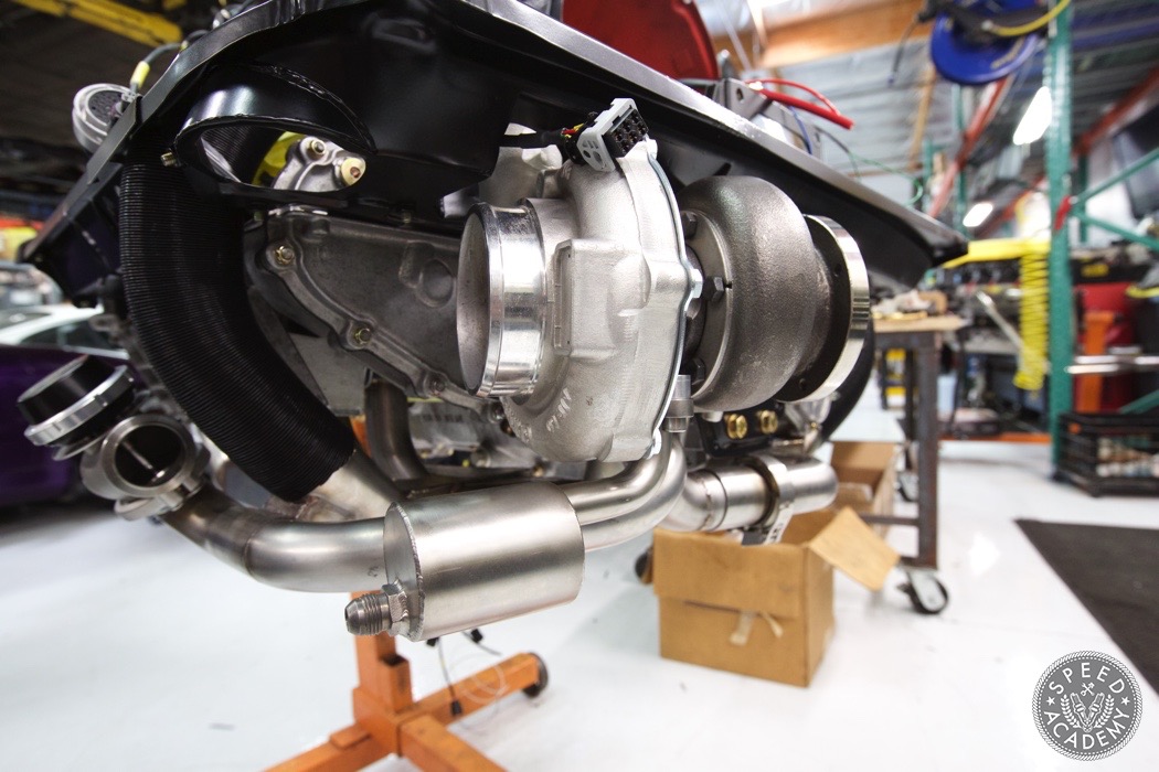 If you look closely at the turbo you can see we utilized a Vibrant rubber coupler that reduces from 4-inch to 3-inch. It was a helluva tight fit but there weren't many other options since we wanted to use a 3-inch intake pipe. http://speed.academy/wp-content/uplo...-turbo-065.jpg Speaking of, John the fabricator at TurboKraft whipped up this intake pipe and used an AEM dry filter. http://speed.academy/wp-content/uplo...-turbo-079.jpg It too got the black paint treatment. I should also say that fitting a 3-inch pipe into the Vibrant coupler and between the frame and engine proved to be a huge PITA. It's actually touching the frame a bit so I may end up denting it in to fix that in the future. http://speed.academy/wp-content/uplo...-turbo-080.jpg And there you have it! The rebuild trans and engine are mated up ready to install. http://speed.academy/wp-content/uplo...-turbo-073.jpg I took a week off since my GF came to town so we went on a west coast trip while Chris and Mike hung the engine. http://speed.academy/wp-content/uplo...-turbo-074.jpg Mike also wired the car including the bad ass bulk head connectors. http://speed.academy/wp-content/uplo...-turbo-078.jpg The AEM Infinity EMS will reside up front in the passenger footwell and wait till you see the rats nest of wiring we pulled from the car. There was an old alarm installed and it was a MESS. http://speed.academy/wp-content/uplo...-turbo-077.jpg I forgot to mention for the fuel system we had to change out the -6AN line and switch to -8AN in between the AEM fuel pumps since they state that a minimum of -8 line has to be run. Nevertheless, routing the lines to the pumps proved pretty effortless as we ran it down the side of the chassis where the AC line used to reside. http://speed.academy/wp-content/uplo...-turbo-075.jpg http://speed.academy/wp-content/uplo...-turbo-076.jpg |