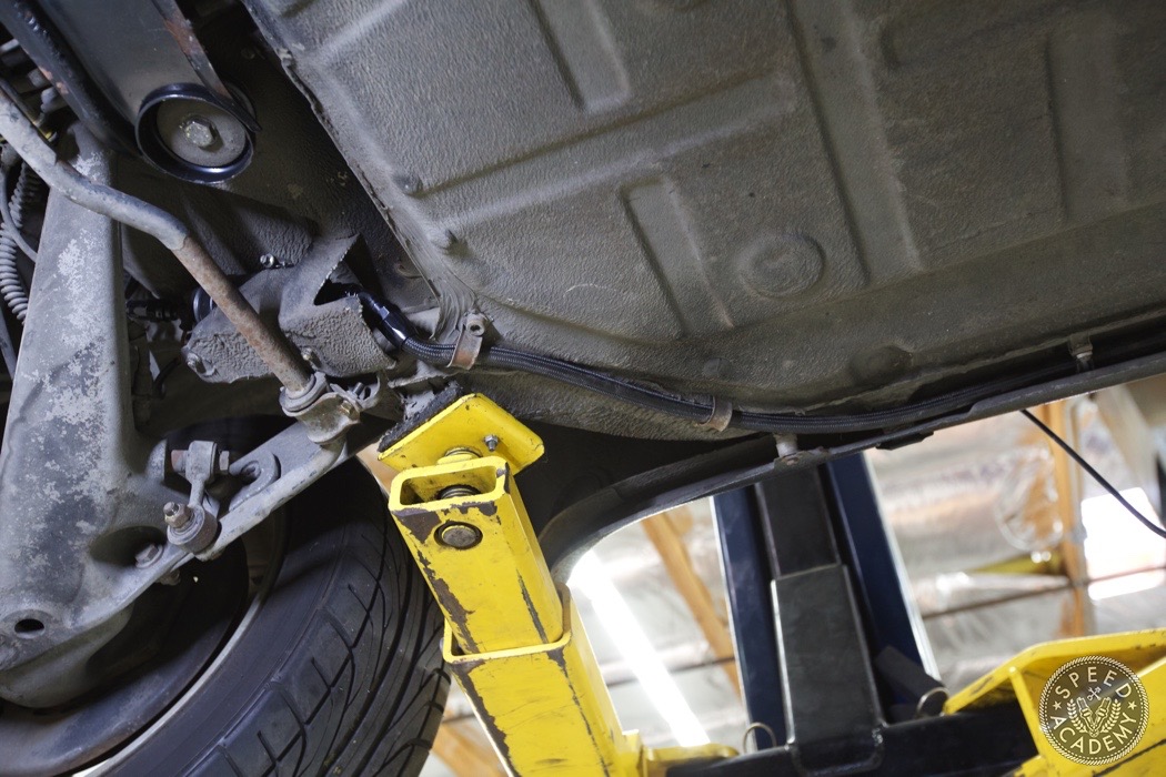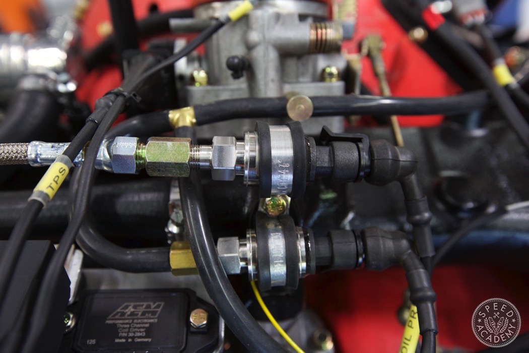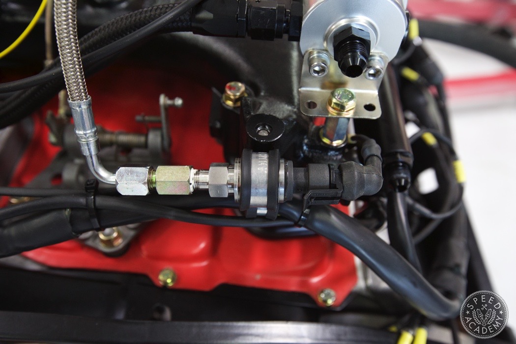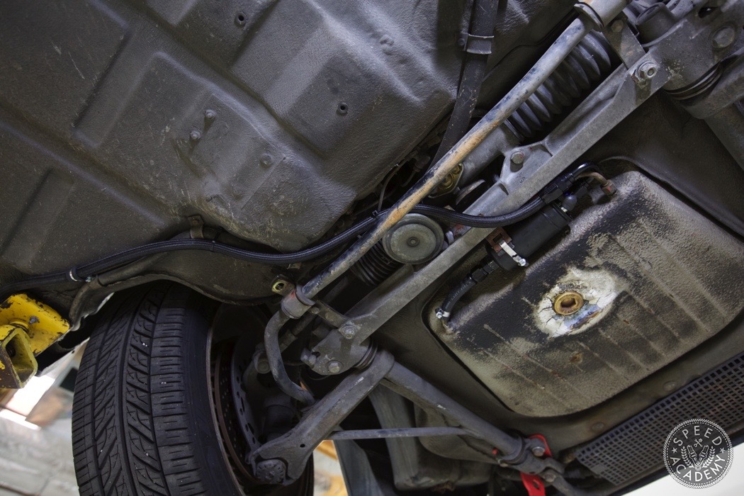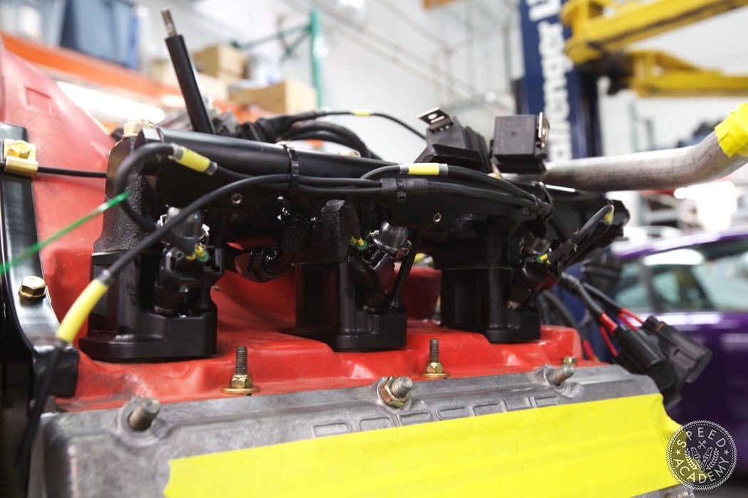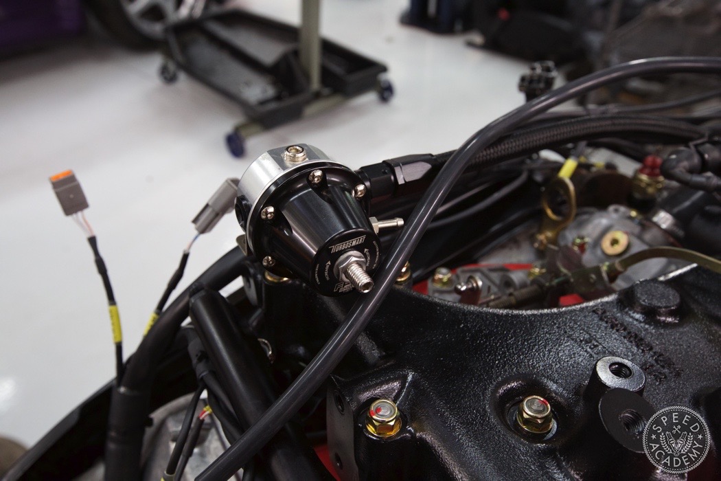 If you look closely at the turbo you can see we utilized a Vibrant rubber coupler that reduces from 4-inch to 3-inch. It was a helluva tight fit but there weren't many other options since we wanted to use a 3-inch intake pipe. http://speed.academy/wp-content/uplo...-turbo-065.jpg Speaking of, John the fabricator at TurboKraft whipped up this intake pipe and used an AEM dry filter. http://speed.academy/wp-content/uplo...-turbo-079.jpg It too got the black paint treatment. I should also say that fitting a 3-inch pipe into the Vibrant coupler and between the frame and engine proved to be a huge PITA. It's actually touching the frame a bit so I may end up denting it in to fix that in the future. http://speed.academy/wp-content/uplo...-turbo-080.jpg And there you have it! The rebuild trans and engine are mated up ready to install. http://speed.academy/wp-content/uplo...-turbo-073.jpg I took a week off since my GF came to town so we went on a west coast trip while Chris and Mike hung the engine. http://speed.academy/wp-content/uplo...-turbo-074.jpg Mike also wired the car including the bad ass bulk head connectors. http://speed.academy/wp-content/uplo...-turbo-078.jpg The AEM Infinity EMS will reside up front in the passenger footwell and wait till you see the rats nest of wiring we pulled from the car. There was an old alarm installed and it was a MESS. http://speed.academy/wp-content/uplo...-turbo-077.jpg I forgot to mention for the fuel system we had to change out the -6AN line and switch to -8AN in between the AEM fuel pumps since they state that a minimum of -8 line has to be run. Nevertheless, routing the lines to the pumps proved pretty effortless as we ran it down the side of the chassis where the AC line used to reside. http://speed.academy/wp-content/uplo...-turbo-075.jpg http://speed.academy/wp-content/uplo...-turbo-076.jpg |