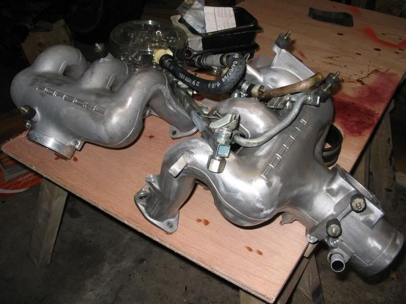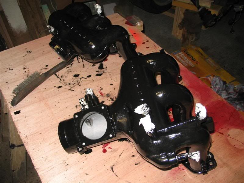 I was going to polish the aluminium manifolds: you can see I started to, but these parts are sand casted and hence pretty rough. So I decided on the paint option, POR again, primer, and black engine enamel.