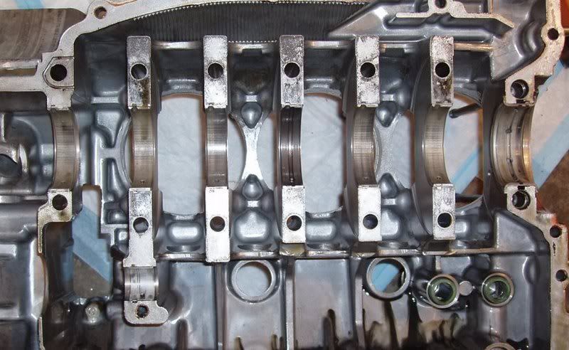 Both factory and after market bearing alike. One quick note: A visual inspection of the case shown below indicates that the main bearing saddles show movement. This shuffling can be minimized by applying a thin coat of LocTite 574 to the contact surface. Short of shuffle pinning the case nothing will prevent movement 100% but the 574 adds shear resistance that can be measured and witnessed during disassembly.. ![]()
