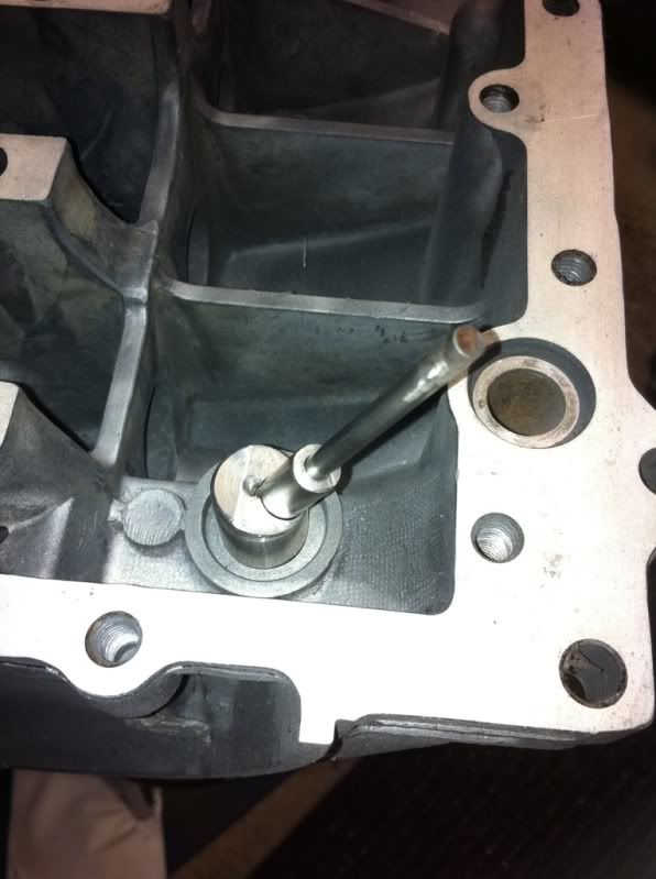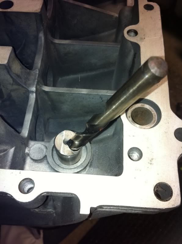 Drill the pilot hole: ![]() Finished size hole: ![]() This is how the fixture stays in place: ![]() Tapping for the plug, made a special short tap and ratchet since there is not a lot of room on the 2.7 with that extra web: ![]()