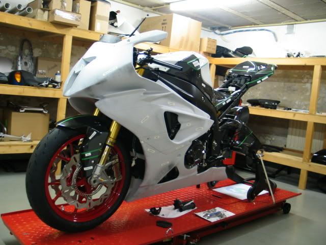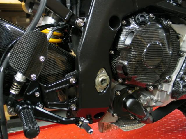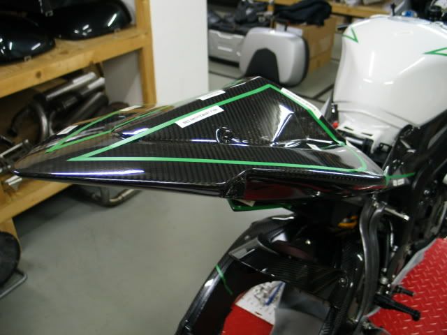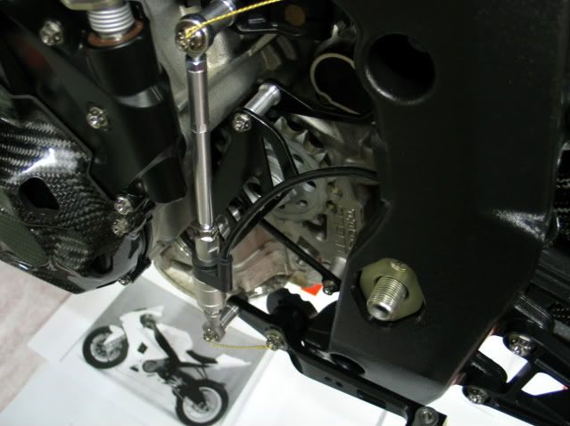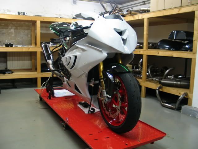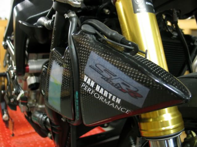 ![]() ...for example ; Ti all over the place... ...as in : nuts, bolts, pipes, etc.etc.etc... ![]() Akra ![]() adjustable steering damper ![]() CF body work (and with all tiny (and sometimes green) lines, in order to help the painter what color he has to use) ![]() shiny and newCF... ![]() ![]() Braking wave discs on the front ; red wheels, and this fine Öhlins FGRT fork .