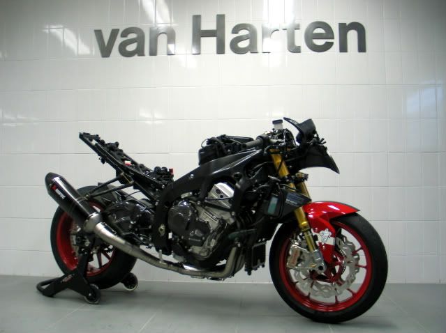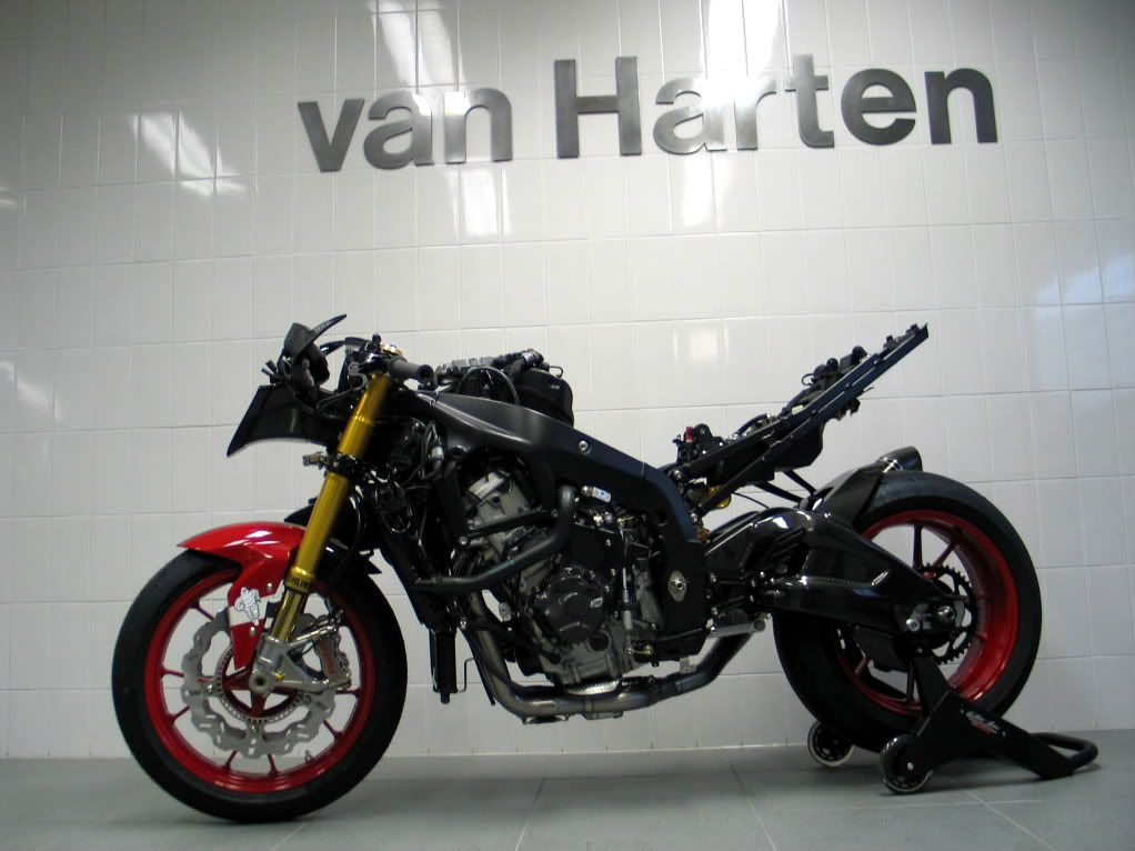 After the Wiki-leak affair, I have a few VanHarten-leaks for ya ! In a dark cellar somewhere in Amersfoort a few of the Van Harten boys are very busy transferring a stock S1000RR into their new Hartenjäger #5. Number 1 was a R1100S, number two this world famous K1200S (at this moment for sale here (hit the occasion button)), number 3 was a R1200S, and number 4 was a HP2 Sport (also check Van Harten Performance - Van Harten Racing) ![]() number one ![]() number two ![]() number three ![]() and number four And as said ; their 5-series (…) is a S1000RR with A LOT of nice, and extremely expensive goodies. Just because it’s possible. And from that moist dark room, I already have a few leaked snapshots for those who like it. ![]() Really thick carbon engine protection stuff (clutch cover), a huge amount of Ti (or do we have to call it TIT these days…) bolts, and a lot of them with tiny holes drilled in it, to secure the stuff, and those gorgeous Alpha Racing (alpha Racing - Startseite von alpha Racing.) rear sets. ![]() Shiny light weight race style quick shifter, instead of the stocker, and again drilled Ti bolts all over the place. And a carbon alternator cover. ![]() On the previous Hartenjägers we could find Wilbers suspension (WhitePower on number one), but…, on this one the stock rear shock is already replaced by a beautiful made, highly multi adjustable, and very expensive Öhlins. Wilbers has a rear shock in their program for the S1000RR, but they haven’t got a front fork. And Öhlins has. So…, choice made ! And I’ve already seen the new front fork…, and man…, that’s some beautiful piece of machinery, and very (as in : VERY !) expensive. Every front fork is totally custom made ; and is by far something different than a ‘off the shelf’ fork. Also in the picture the complete resprayed, black rear forks, with a carbon protection kit, and a black sub frame. ![]() On the front the ordinary plastic container is replaced by a very lightweight, and nifty looking carbon one, an it's the same one Corser has… BTW ; in these pictures you can still see the stock BMW S1000RR forks. The Öhlins fork is still safely tucked away. ![]() And instead of the stock plastic air induct, the new one is also a carbon one, including a fantastic looking carbon instrument holder. And it goes on, and on my friends. As soon as I can dig up more pics, I will leak them…, but you can expect a lot of nice details… ![]() BTW ; introduction of number 5 is scheduled for March 19, 2011. So ; stay tuned ! (BTW ; this could be some shreddr-like kind of project… ; except for the Wossner stuf…) .