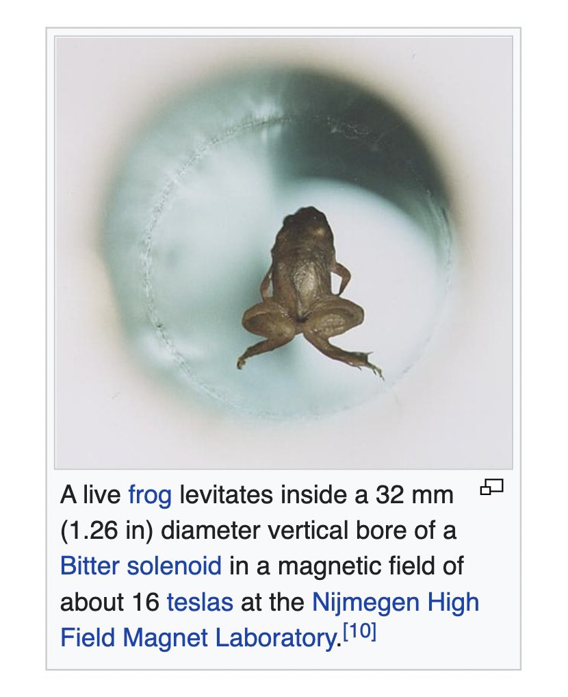 What's REALLY whacky is that with a big enough magnet, you can float stuff that you wouldn't think was magnetic. ![]() Here's a floating drop of water that is floated using only a magnet. ![]() This was done in 1997. https://www.science.org/content/article/floating-frogs Quote: