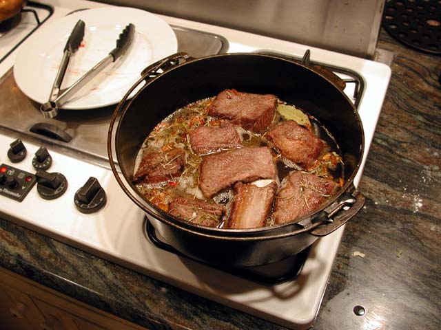 Here's my favorite pot--an antique Griswold cast iron dutch oven. In this case filled with browned short ribs, wine and herbs, ready to go in for a night's cooking. http://www.rallystuff.com/images/braising.jpg |