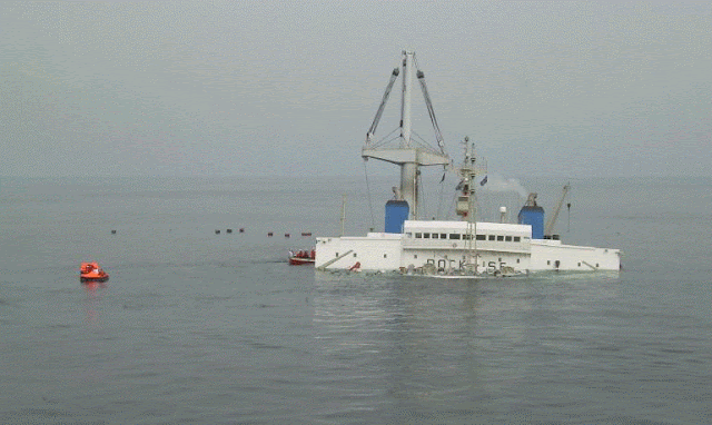UPDATE- From The Cargo Letter -March 21 2007 -- M/V Mighty Servant 3 -- in preparation of the planned salvage the SMIT Salvage vessel M/V SMIT Orcahas anchored over the sunken heavy lift cargo vessel which still has the top of its derrick above water. From our Sr. Correspondent Tim Schwabedissen. (Wed. March 21 2007) UPDATE- From The Cargo Letter - June 18 2007 -- The vessel was resting at the sea bottom in approximately 52 meters of wate. SMIT Salvage conducted a complete diving survey prior to removing the vessel's bunker oil and pollutants. Moreover SMIT Salvage was contracted to salvage M/V Mighty Servant 3 in order to give her a second life. After having finalized the M/V Nautilus salvage project the sheerlegs cranebarge Taklift 7 immediately departed for Angola. Futhermore diving vessel M/V Smit Orca was mobilized. M/V Mighty Servant 3 was salvaged by means of sheerlegs cranebarge Taklift 7 and by pressurizing the various compartments with compressed air. Initially the bow was refloated and stabilized. Subsequently the stern was lifted. Ultimately the vessel was fully dewatered and successfully redelivered to the owners on 26 May 2007. http://lh3.ggpht.com/_8mgirdLNhIo/TK...htyserv.11.jpg |