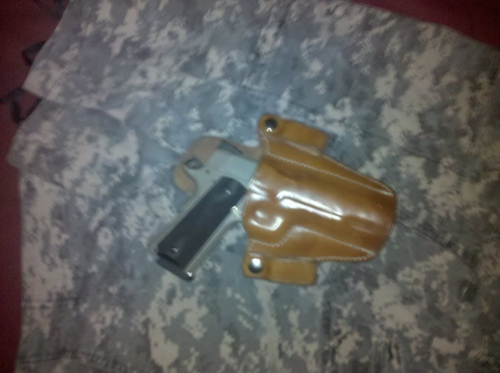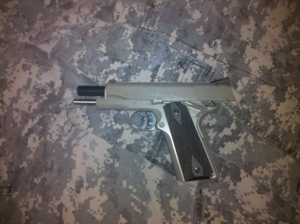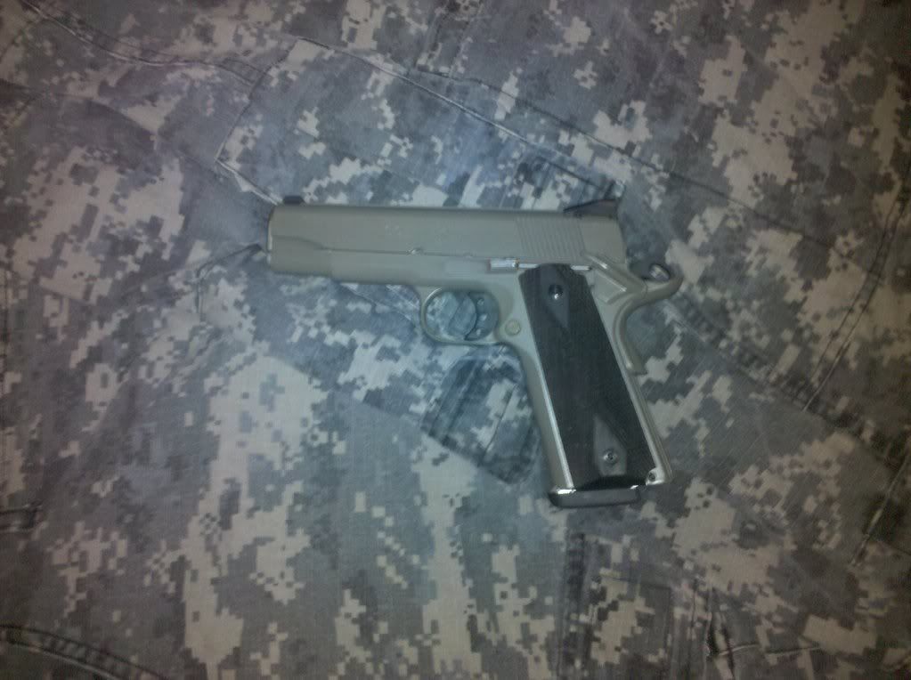 ![]() Here's the actual gun: ![]() ![]() ![]() It's a Colt Combat Commander Series 80 that I picked up pretty well used for dirt cheap. It was two tone with a ton of wear marks, a crappy looking hogue rubber grip and had a serious FTE issue along with a front sight that liked to wander out of the dovetail. A mix of Ed Brown and Wilson parts. several hours of tinkering and a little paint and it eats any ammo I put through it and doesn't look half bad either. |