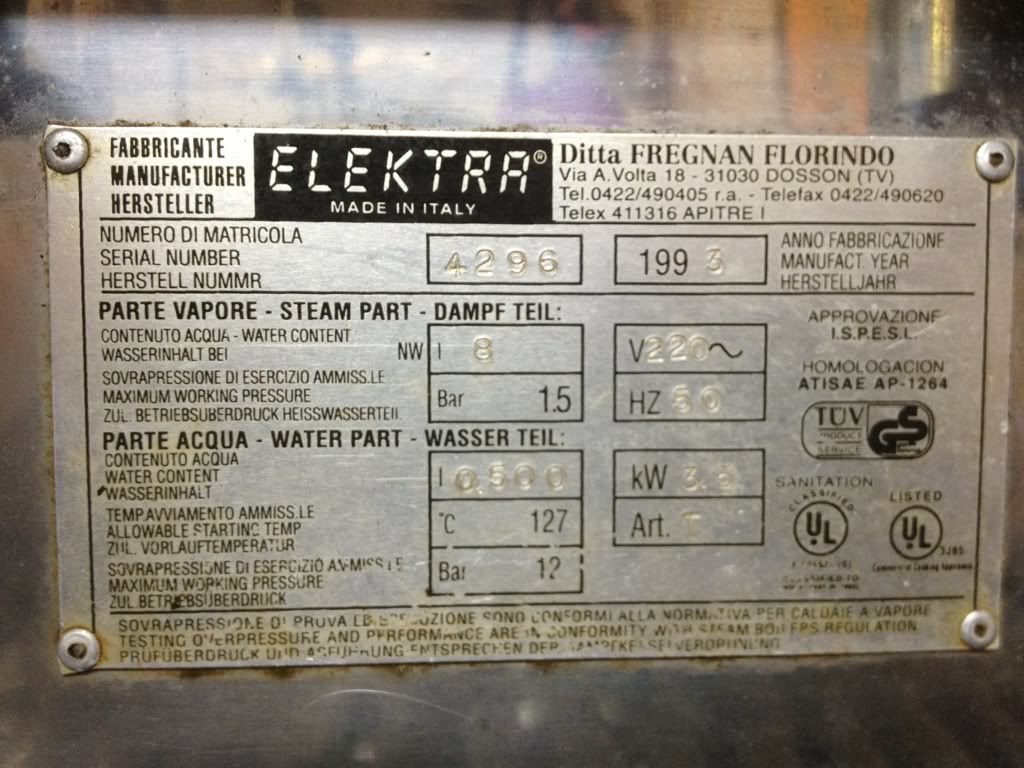 In case the second picture is too blurry, it is an "Elektra", made 1993, holds 8 L water, works at 1.5 bar, requires 220v (which I have in the garage and could have in the kitchen.