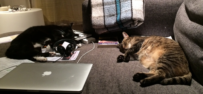 Milo (RIP) and Twiggy. My wife jokes that she is jealous of Twiggy, as that cat follows me around and insists on being on or near me. And if my wife comes and sits next to me on the couch Twiggy will invariably jump up and try to sit between us.    | ||