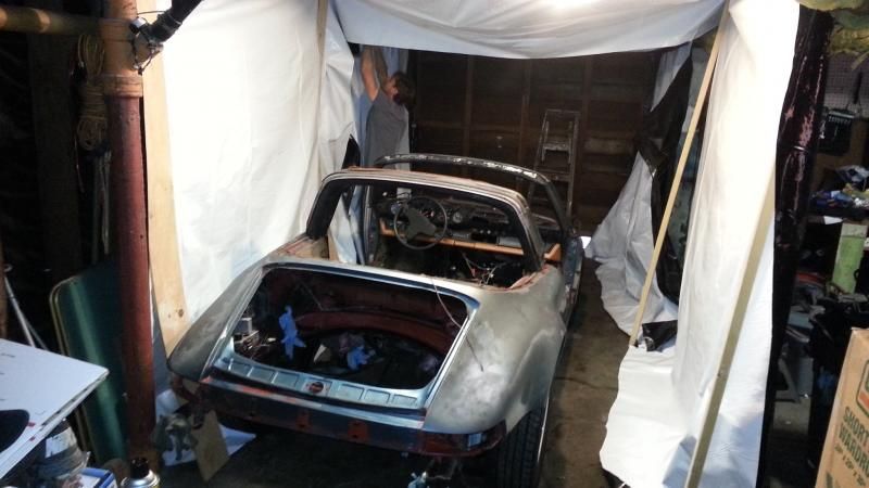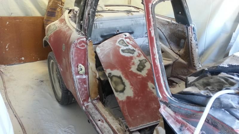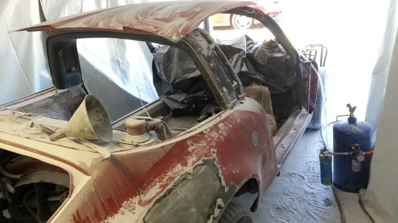 My car was originally guards red, then resprayed red again, then resprayed petrol blue i believe. I plan on respraying it guards red w Glasurit 22 if I can get it. I have managed to get rid of all the blue which was a primer/base/clear and all the second round of red/primer. Some areas had the respray over bondo/bare metal and some areas they left the original finish. If I have no rust can I prep the original finish to paint over? Some areas have cracking all the way through and I have no choice to go all the way down, but why not leave at least the original primer where I can? Does the soda have any effect on the situation? I don't mind having to clean and sand it after. I have a few set of extra hands to help me with that side of things. I'd love opinions. I'd also love to save some time and $$ on media. So many coats of paint on this thing! ![]() This is when I was in the process of building the tent in my garage. ![]() ![]() |