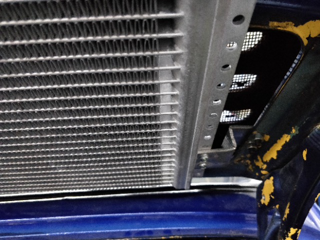 Here is a factory style condenser on a '74 with a 3.0 cis engine. Note the factory center bracket effectively sets the height.