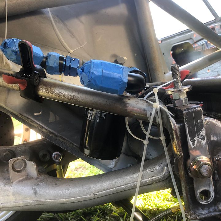 Got one of the closing plates for my fender well reinforcements made. Dimple dies make everything look better! ![]() Rear swaybar "nuts" for the JWE high clearance mounts ![]() ![]() Got those knocked out so I could mount up the rear swaybar again to check for clearance with the proposed oil filter location/bracket. Anyone have a good reason why this is a bad place to put the oil filter? It clears all the suspension in full bump and droop, comes off fairly easily, should be reasonably well protected there, it's low, and running a 993 oil tank, space is somewhat limited without mounting it like a 964 which seems like running oil 3 sides of a square for no good reason.