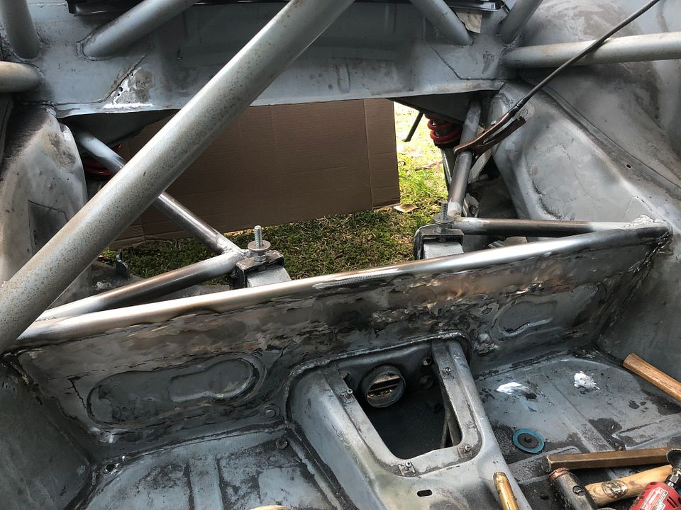 I should know by now that "bolt on" parts on cars does not imply that they fit, only the attachment method....... and so I now have 30 more hours of grinding, cutting, welding, and stripping under my belt. Yea for no hidden chassis cracks I guess. ![]() but the round part of the torque tube sticks out too far for the bracket to sit flat on the threaded studs. So several hours of grinding got me here to where it would fit. ![]() But the weld to the central tube had been ground through so I need to grind that back more and weld the end of the tube back to the car.... and the "while you are in there's" set in. ![]() It got ugly........ things got warped, lessons were learned, not the least of which is I need to start wearing a real breather when welding on weld thru primer. ![]() But lots more grinding and a little paint later..... it's not looking soooo bad and things fit! ![]() A little undercoating back on there will hide the ugly. Now just repeat on the other side! ![]() And then I started in welding the seat pan back together. ![]() ![]() And that's how things will stay for a few weeks as I'm flying to Germany on Saturday to propose to my Girlfriend. Covid over the last year and a half really hasn't made the long distance thing easier but if we survived that..... I'm taking it as a sign.