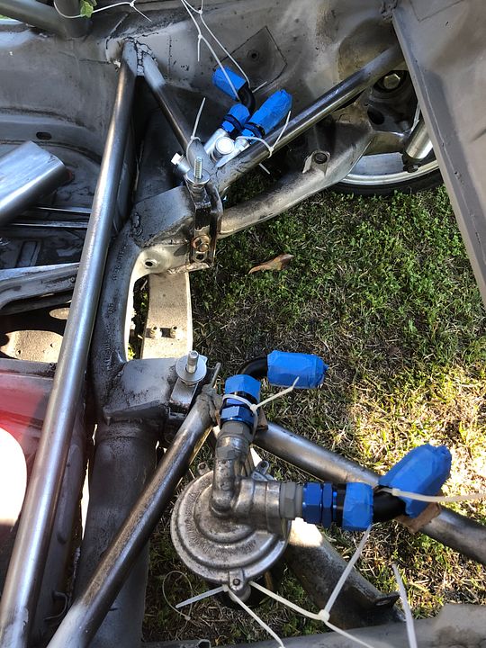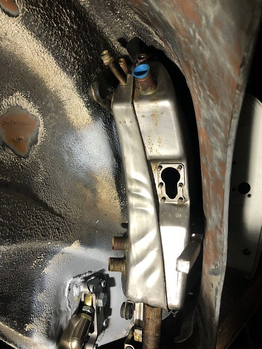Vertical part of the rear seats are back together ![]() Bought a tubing bender for hard the oil line fabrication and reinforcing the front inner fender area similar to 964/993 and 911 Targa reinforcements ![]() Still thinking I will weld some sheet metal between the reinforcement with some dimple die holes ![]() Started mocking up the oil system for AN16.... I think the oil filter will stay here but the thermostat I think will end up in the smugglers box. Not a lot of room once all the giant AN16 lines are in there. I went with a 911 thermostat and a 964 oil filter console as there isn't much aftermarket setup for AN16 fittings and I like the pressure release circuit in the stock thermostat. ![]()