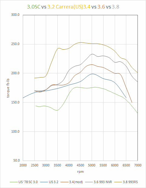but in a way I see what you are saying, compare the 3.8Vram torque curve(aka 'The Buffalo") w/ the 3.6nvr( aka 'the Pouncing Puma'), When I had a 3.8RS in my '76 it was not as sporty feeling(aka fun) as the 3.6 w/ cams the Pouncing Puma is what what makes for a fun sporty drive. w/ the right gearing not ot the same scale as the above but just compare the gross character of these Note the Pouncing piuma in the 2.4S and the 2.7RS, which surprize the engines most prized for sporting behavior, I owned a 2.4S and while it was a ball on the track it was not so much fun for around town use. ![]() here's another look, the 3.6Rs and 3.6stock nvr are 993 non vram motors the Rs w/ RS cams has a more pronounced Puma shape, the Dashed red is a well built 3.2 ss the main thing to like there is the extended rev range which is much more able to take adavatage of gearring