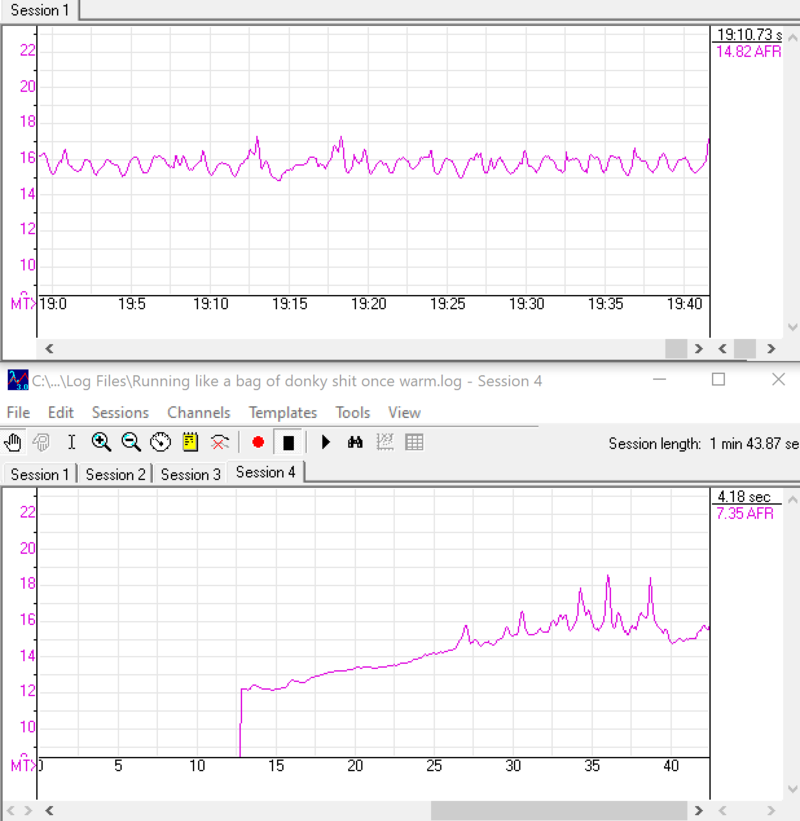 I also have datalog showing the issue if thats at all helpful. Top is running well between 45-55% Dwell - Bottom is after heat soak startup - running not so well. |