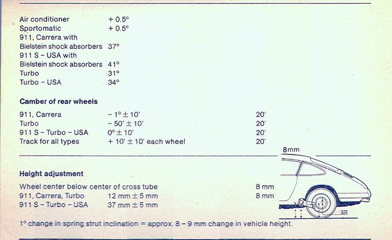 front: Wheel center above middle of torsion bar back: Wheel center below center of cross tube get on a flat surface, measure the heights to each point and subtract appropriate pairs. I don't know what year you have, but my 78-81 book 930 values are: f: 94mm (85 US)+-5mm, max L/R diff of 5mm r: 12mm (37 US) +-5mm, max L/R diff of 8mm At front the axle is above the bar and at back the axle is below the tube. If there's no misprint in my spec book, the US settings have alot more rake than the RoW cars. |
