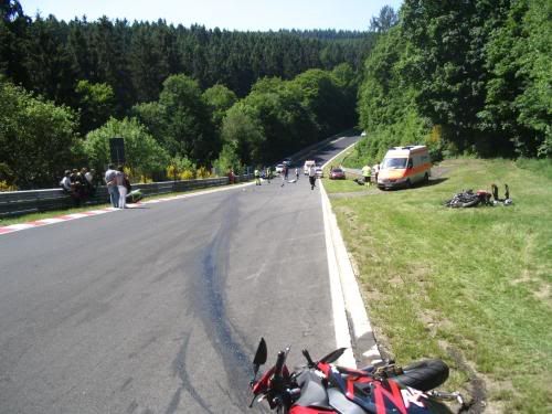 Deadly day at the Nurburgring Sunday 11 Jun 10:30. A 24 year old on a Honda CBR 1000 motorcycle looses control of his bike on the hill in Fuchsröhre a very high speed section of the track with small but blind uphill corner, after tumbling more than 100 meters he struck the guard rail suffering fatal injuries. By now a car driver who had no time to brake, crashes into the motorcycle in the middle of the track. Because of the location of crash two more bikers’ age 42 & 48 approached at high speed and were not able to stop in time to avoid the oil and debris on the track, both crash suffering light injuries. Seconds later a Porsche 997 and a M5 BMW approach and manage to stop in time but a 54 year old man on a Ducati traveling close behind the Porsche could not hitting the rear of the White Porsche, the force of the impact throws the 54 year old man over the car landing in front of the BMW he also suffers fatal injuries........ Track was closed for about 6 hours...... Lots of talk that the owners should run cars and bikes at separate times but I don't think they will ever change.... Despite the carnage I will still continue to ride and enjoy this incredible place.....My boss also a rider had this crash happen almost in front of him and despite having seen death up-close he continues to ride this place as well.....Place is worse than crack...... that’s the only way to explain it ![]() ![]()