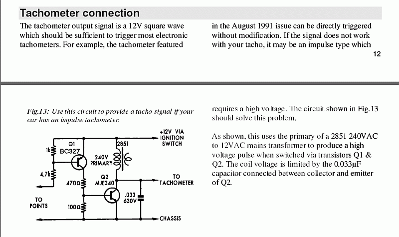 Another possible solution is to build a small circuit to give the 'impulse' signal that an early tach is expecting ... which, as you suspected, is not as high as the CDI output to the coil primary '+' terminal! The following article suggests a small two-transistor circuit to drive early impulse tachs. The original article (first URL) has fig.13 on p.13 and discussion in the last paragraph. http://www.not2fast.com/ignition/cap-dis-ignit-cdi.pdf http://www.molla.org/DIY-CDI/SC-DIY-CDI-article-hires.pdf ![]() ![]()