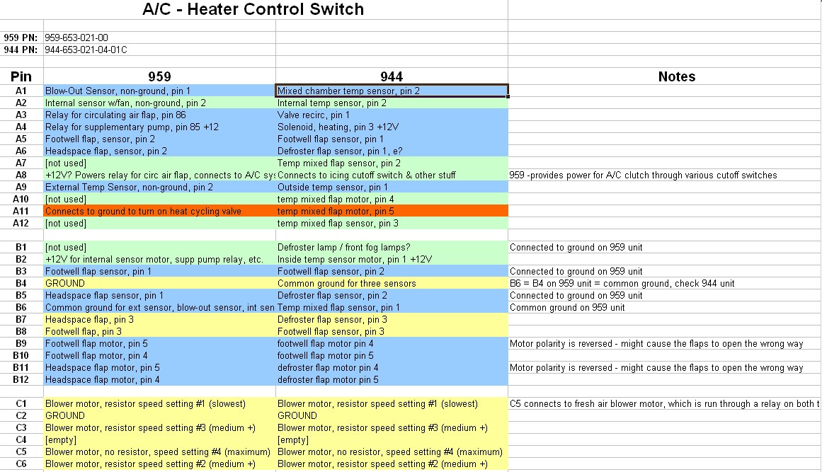 Here's a spreadsheet that I did comparing the two electrical diagrams: The items in light blue are where the signal wires are similar but not exact. Like pin A5 connects to pin 2 of the footwell flap sensor on the 959, and pin 1 of the footwell flap sensor on the 944. The polarity of the motors is reversed, so I think that this is correct for the 959. The 959 uses a unique heater assembly that may be wired backwards from the 944 one. Seems that way from the electrical diagrams. Items in yellow are a direct match. Items in green are not used on the 959 but appear to be used on the 944. Basically the main difference seems to be that the 944 has some type of third flap and sensor that the 959 doesn't have. This is called the "temp mixed flap" on the electrical diagrams, and I don't know exactly what this does. I'm thinking that it's a flap that meters fresh / cold air and hot air and cycles back and forth depending upon how much is needed. Perhaps 944 experts could chime in on that. All the other sensors seem to match up. The two items in red are the oddballs. The 959 has a water cycle valve that is ON when there is no power to it (a safety mechanism so that the car fails to full heat when the system fails - better to sweat than to freeze to death in the winter?). This valve is connected to pin A11 on the 959. Pin A11 on the 944 connects to the motor on the mixed temp flap. The 959 has a vent sensor that connects to pin A1. On the 944, pin A1 connects to the mixed chamber temp sensor, so those seem to match, sortof. The big question is with pin A11 - will the 944 work the way that the 959 one does? That is a good question, one that I'm not sure of. The 944 diagram seems to indicate that +12V would be applied to this motor terminal at one time, and then possibly switch to the other terminal (A10 which is not used by the 959), to reverse the direction of the flap. If this effect is equivalent to the cycling effect of the heater valve then it might work. Then again, pin A4 of the 944 unit seems to do what I would think that pin A11 would do. I'm not sure. Any thoughts or suggestions are welcome. Here are the links to the files: http://forums.pelicanparts.com/uploads11/944-heating_elec_diagram.JPG http://forums.pelicanparts.com/uploads11/959-heating_elec_diagram.JPG -Wayne