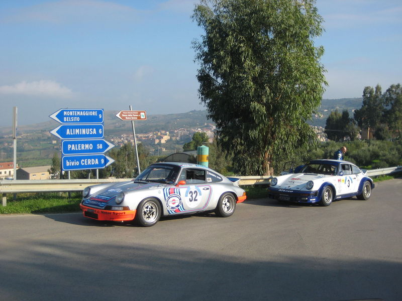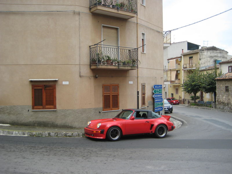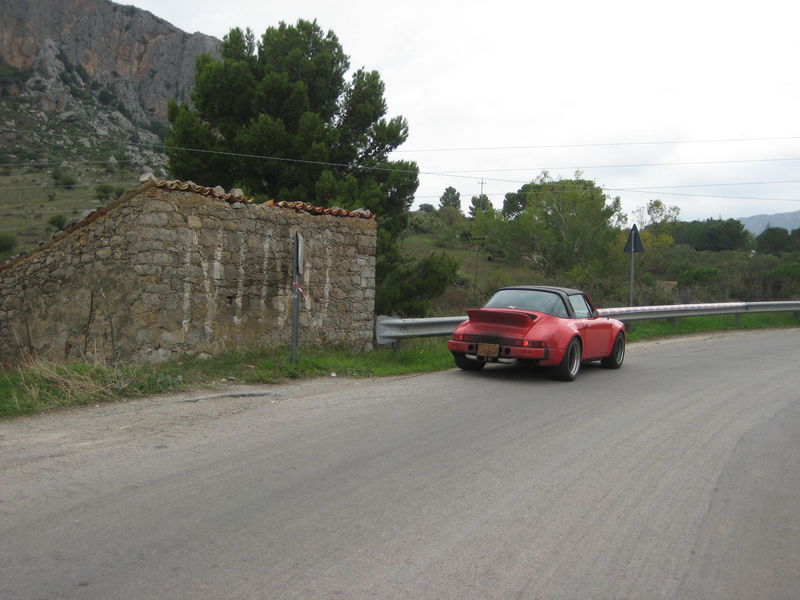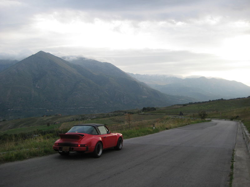 So, with the girlfriend and Caccamo still fast asleep, i woke up early Sunday morning at sunrise and went and fired up the old SC. While she warmed up, i walked around and looked at all the road grime, brake dust and exhaust soot on the tail and decided that yes, this was indeed the only fitting way for her to end the trip. So, with exhaust resonating off empty cobblestone streets, i headed out to meet the Targa. Ever since i had been interested in Porsche, i had heard of this race, this 'Targa Florio' with which the history of the marque had been inextricably intertwined. Now, i would finally get to drive the route. Would there be anything left or signs of the old race? Would it be anything remotely similar to pix and vids i had seen? I would trace the entire route of the Targa, starting at just before Cerda, winding up to Caltavuturo, then down to Scillato and through Collesano, with a final run straight down the mountains to Campofelice di Roccella All this floated through my head as i drove through the beautiful Sicilian countryside at dawn. The landscape of the island is particularly striking at dawn and sunset, with farmers doing what they have been doing since Roman times. Being so close to the ocean, there is a thick mist which enshrouds the landscape and mountains around Caccamo at sunrise that i find particularly picturesque. ![]() ![]() ![]() Sunrise on the road to the Targa ![]() ![]() At first it looked like it was going to be a clear day, but the weather can change quickly on Sicily, and clouds rolled in and drops fell as i finally arrived at the starting line where i had been the last two days. Being sunday morning, the road was pretty much deserted as I wound my way up the first part of the route, just as i had the day before. I wasn't able to push it very hard, as the road was fairly slick from the light rain. From this 1973 documentary YouTube - Targa Florio 1973 documentario francese 3 parte, you will see that the main obstacles back then were farm animals and slow moving traffic... the road looks like it was in excellent shape. However, the main thing slowing you down on the Targa Florio road today, is the presense of numerous cracks, dips and irregularities in the road due to the instability of the soil in the regions. There had been a lot of rain recently, and this compounded the problem. Other than that tho, the road is THE same road as that on which the Targa was last run 36 years ago. More building have been built in some parts, but not many, and if you look at pix and vids from the 60's/70's, most of the same features are still there, as i found out. Through Cerda at not quite the speed as the day before or the Ferrari pilot in the video ![]() Drizzle on the first stretch between Cerda and Caltavaturo ![]() And then, magically, the rain and clouds dissipated and the sun came out and a great stretch opened up and i was able to really drive. The road truly is stunning, with the Madonie mountains all around you and getting closer The route to Calatavuturo in the tracks of Elford, Mueller, and all the greats... ![]() ![]()