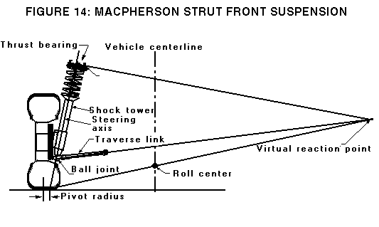 http://1.bp.blogspot.com/_FoXrzNJ_K0...600/fig-14.gif All other things being equal, increasing the track width will actually increase the roll center height slightly, which will make the front end act as if it is stiffer in roll than the same suspension with the same settings, but a narrower track width. Looking at the semi-trailing arm rear suspension, the same is true -- widening the track (all other things being equal) will slightly raise the rear roll center, making the car stiffer in roll. http://www.bevenyoung.com.au/fig13-1.jpg So let me correct myself -- widening the track tends to raise the roll center at that end, which will make the car stiffer in roll and thus load up that end of the car faster. This is compounded by the fact that since the track is wider, and the distance from the center of the car greater, that the tire with a wider track will get a greater load transferred to it since it's lever-arm from the roll center is greater. |