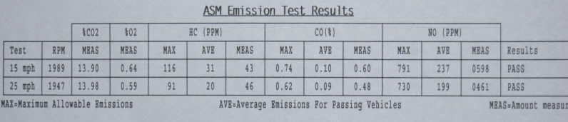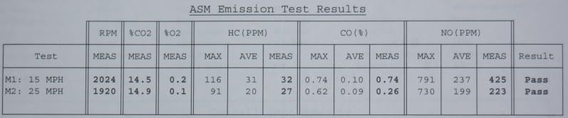 "Lowered based on wear and tear".  That is just plain bull.  Emissions go up with age, not down.  I've experienced the same smog BS, but my car's emissions are on par with those posted above.  I had an old CAT that belched out around 1,200 ppm of NOx, but I had a "newer" spare and it passed at low 200's.