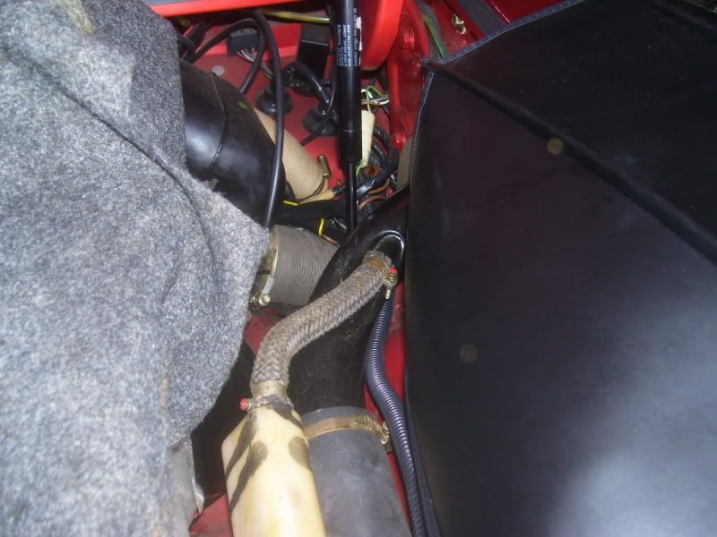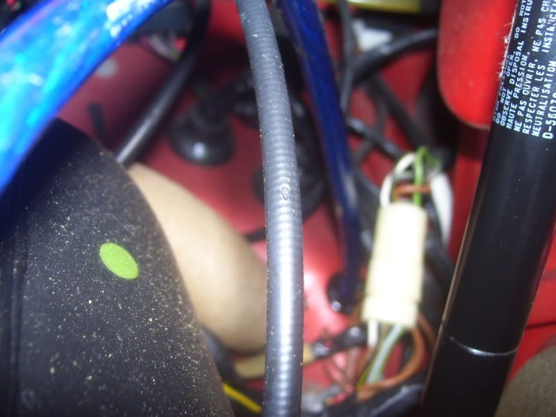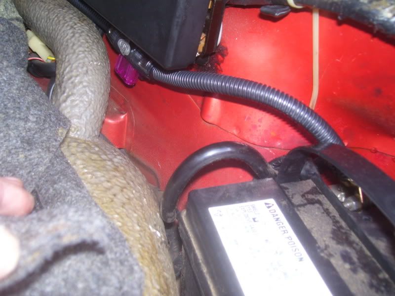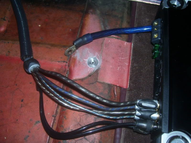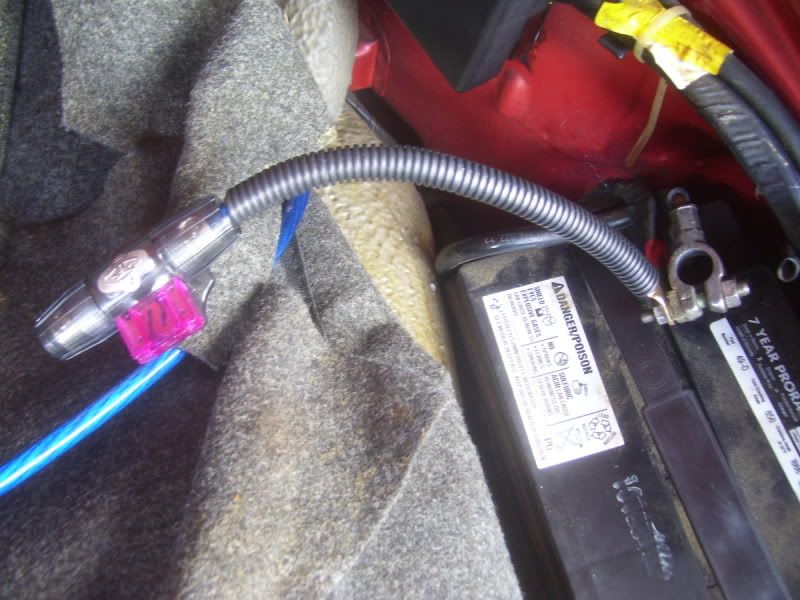 today i got started and got quite a bit done but i still have lots more to go. the system will consist of a jvc kd-sh1000 head unit, alpine spx-177r comps run active in the doors, two sundown audio e8 subs, alpine pdx5 amp.first on the list was to find a way to run a 4g wire from the battery to the cabin. i found a grommet to use (as you look at the car from the front) in the rear right corner of the trunk. ![]() it enters the cabin on the upper left corner of the driver's footwell area. ![]() i ran it under the edge of a few pieces of carpet and ended up under the drivers seat ![]() finished product, no wire in sight ![]() next on the list was attaching it to the battery. used a ring terminal on the end with some heat shrink. ![]() connected it to the battery, covered in split loom, connected to the inline fuse. ![]() i did not want to drill any holes so i used this stuff. it is sort of like plastic velcro only has a much stronger bond. the glue on the back is incredible as well. i have never seen it let go in the 5 years i have been using it. ![]() here is the line attached to the wheel wheel and then running back to the grommet, all covered in the loom. ![]() black line on the bottom