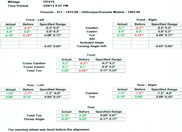 The clutch feels great. The brakes are strong enough to lock up the wheels when you get on them. The car is dead smooth at speed and seems to handle quite well. My issues are this: - The steering wheel is now cocked slightly left (maybe 1 degree) while driving straight, on different kinds of roads. - The brake pedal feels softer than it did with a frozen caliper and doesn't engage for an inch or two. My plan is to drive the car a few hundred miles to see if things settle and shake out, but I'm disappointed. I expected the car to be returned to me tracking perfectly straight with very firm brakes. My experience is limited with these cars. Should I expect a change over time with the same pads and rotors or is this the best pressure I'm going to get? Is it unreasonable to expect a straight steering wheel from an alignment that is within OEM on an '87 Carrera?? I realize it's an old car, and I know these brakes are difficult to bleed, but I would have expected guys who race these things on weekends to know how brakes should feel. I would also have expected someone who just did an alignment to look at the steering wheel and say "oh crap this isn't straight" when they drove it. Alignment specs, for your perusal/critique: ![]() |