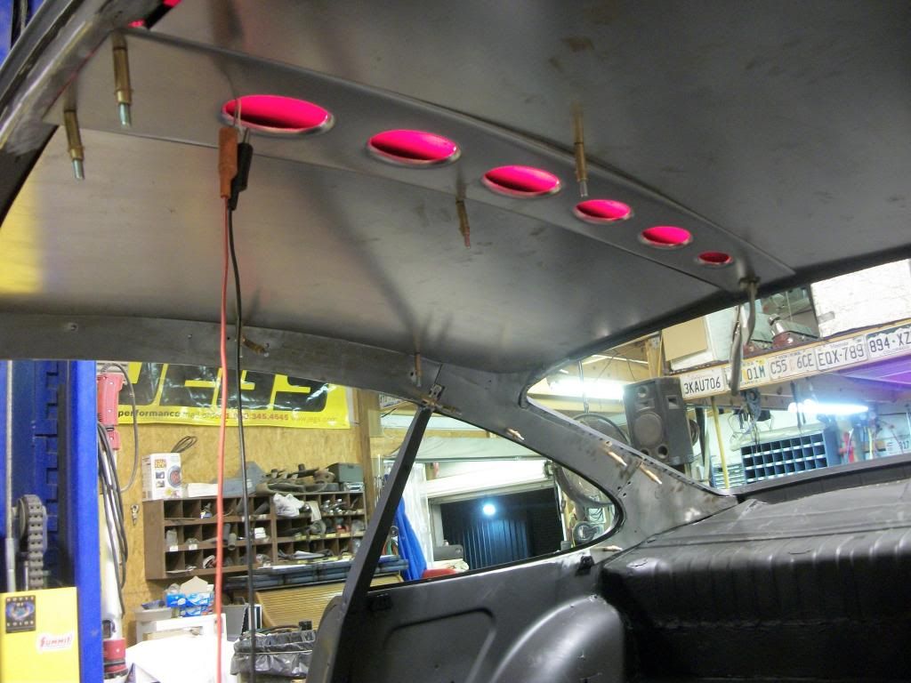 The next what-if's were, how bout we light that thing up? And put bead rolled filler panels in, (not bead rolled yet), and make them removable. http://i1365.photobucket.com/albums/...psf92bddd3.jpg http://i1365.photobucket.com/albums/...ps2e6e5f38.jpg Well, one thing let to another, so let's fill in around the roof rails and smooth all that off, and simply paint it satin black, like the rest of the car. http://i1365.photobucket.com/albums/...psb83f6c76.jpg http://i1365.photobucket.com/albums/...psd8e1617c.jpg Two rows of Red LED's mounted inside the center divider lends a real aircraft cockpit look. After all, the P-38 was a stealth bomber and operated mostly at night, so all you veteran bomber pilots remember that Air Force 90 degree flashlight that was issued with the red lens???? I've still got my dads and it still works. Anyway, that flashlight was the catalyst for this idea. http://i1365.photobucket.com/albums/...ps62caa159.jpg |