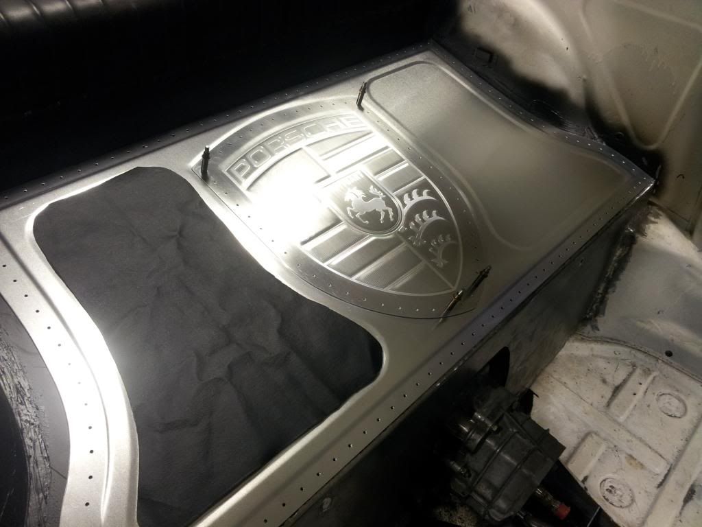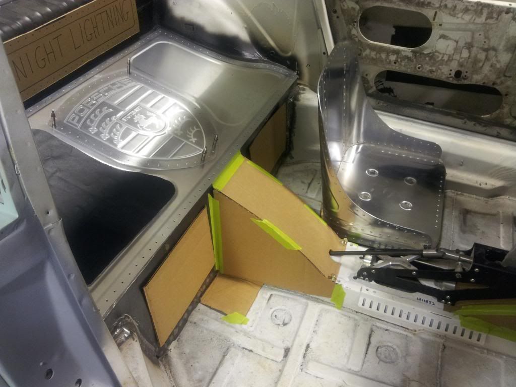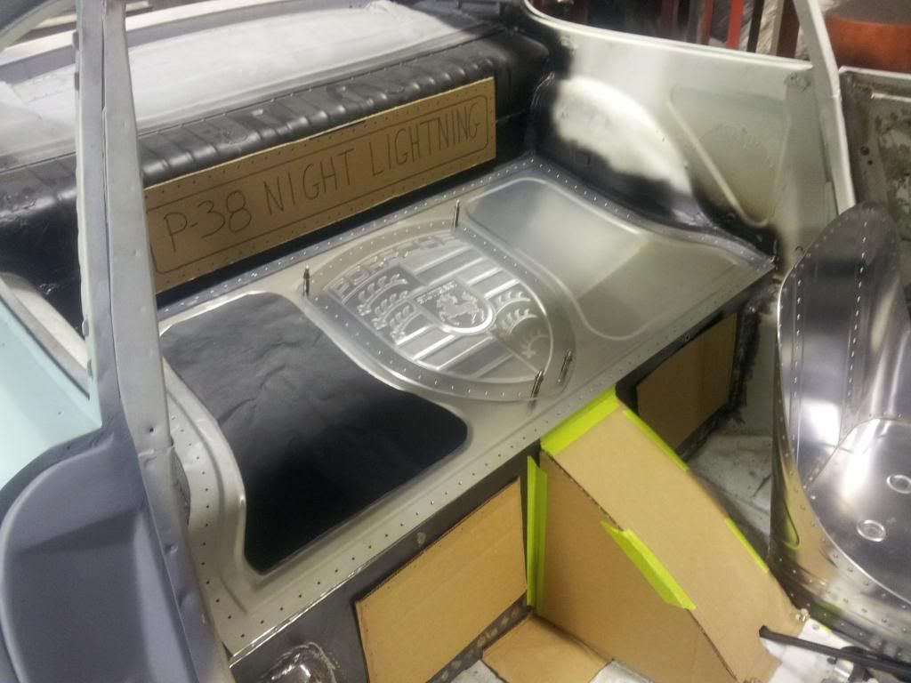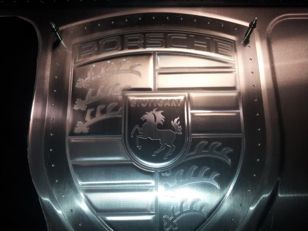 Interior. This is a work in progress and keeps changing here and there. But you can see the overall theme, and there have been a few changes since the picture was taken. BTW, that Porsche logo is entirely hand made and bead rolled. There will be black leather accents on either side of it. Just got one side stuck on to see how it fits.