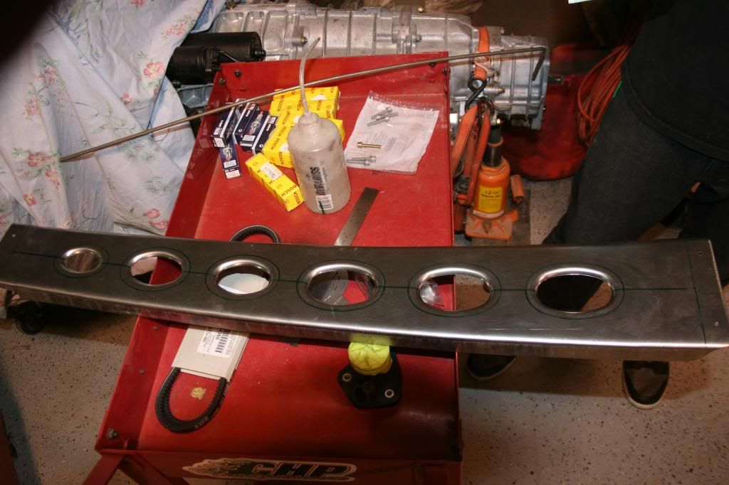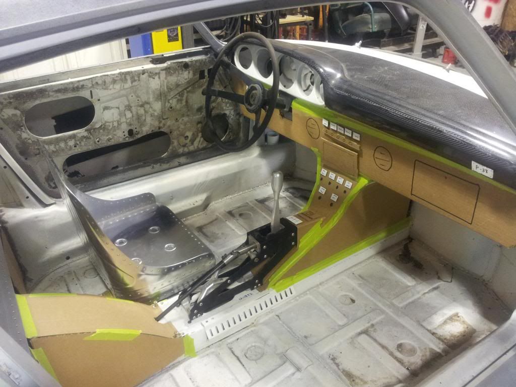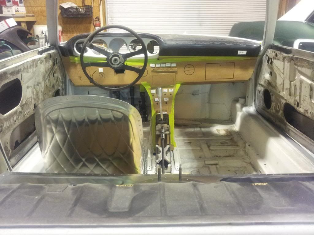 These shots are mock ups in cardboard, and all the front dash stuff will be done in aluminum with tons of rivets, round and oval dimple dies, and such. The stereo system is a DVD head unit with navigation. This shot shows the Hargett shifter and how it will flow into the front dash, but the rear of it is left exposed. http://i1365.photobucket.com/albums/...psaccedc03.jpg We threw that Night Lightning sign in the garbage! It ended up looking cheesy, so we ditched it for a "waterfall" in aluminum that starts at the rear glass and doesn't stop till it hits the floor! Pix to come later on that part. http://i1365.photobucket.com/albums/...ps0d0059dc.jpg http://i1365.photobucket.com/albums/...psc817b48d.jpg Close up detail of the engraving and bead rolling. http://i1365.photobucket.com/albums/...psb791c8d6.jpg http://i1365.photobucket.com/albums/...ps1877c5eb.jpg That is a carbon fiber dash from Clint at Rebel Racing. Seems a shame to cover that pretty stuff, but we gonna cover it with padded black leather with french seams stitched in red. http://i1365.photobucket.com/albums/...psc1313bf1.jpg |