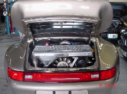 The problem is with the original turbo tail as the picture shows with the wing removed from the hood. The socket is only about 750mm wide. The cooler does fit on the engine but the opening in the hood is much smaller then up against the air-inlet. /J