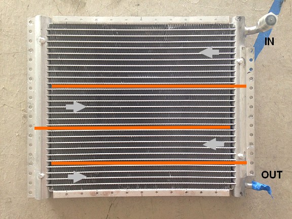 Way this condenser came, fittings pointed straight out the side. Changed them to 90 degree elbows thinking that might work. Test fit proved it didn’t---alignment between male and female were not quite right. This is due to the condenser being tilted forward at the top and angled in at the rear. Nothing is perpendicular. Might have been possible to accept the misalignment---as in force it to work. Thinking vibration and stress in the fitting areas might turn ugly downstream, that led to sorting this out sensibly now rather than later. Wondering exactly how this condenser is made, particularly in regard to what bulkheads must be in the side posts to control refrigerant flow, I called the manufacturer and spoke with the engineer dealing with this type unit. Get a person who enjoy's discussing their contraption and even a simple product like this condenser turns mystical. Hat's off to engineers! http://forums.pelicanparts.com/uploa...1511900361.JPG http://forums.pelicanparts.com/uploa...1511900361.JPG Fellow pointed out the slight dimples located on the fin-side of the posts. This indicates where each bulkhead is. http://forums.pelicanparts.com/uploa...1511900361.JPG This thing has 3 bulkheads. http://forums.pelicanparts.com/uploa...1511900361.JPG The resulting flow. Am dealing with fittings tomorrow. Today am reorienting myself to where things stand with the electrical. (I go on vacation and some things I filed in my head... not there when I get back. Reorientation is essential. I make lost of drawings---that helps.) |
