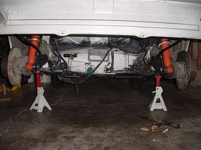 wide open bay. note the konis with progressive coils that came on the white wreck. sway bar/droplinks painted and bushings replaced. soak the bushings in HOT water for 5 min and they go in very easy.