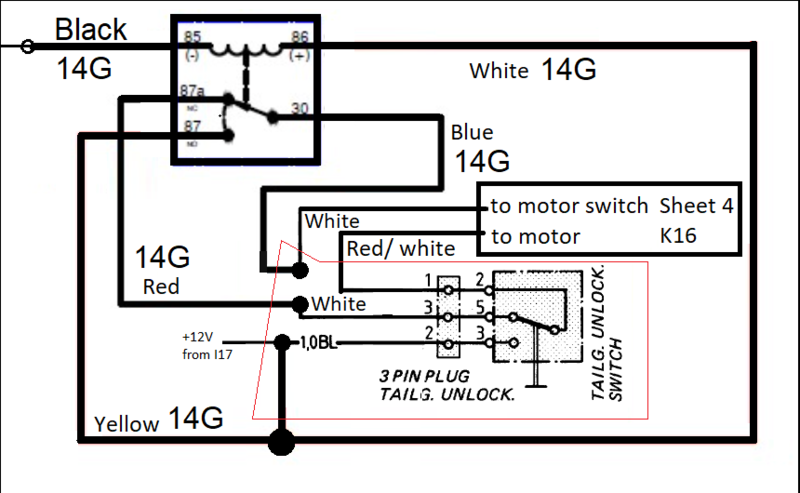 I've been working on installing a keyless entry/ alarm system since the original alarm cratered and I thought I might as well automate the hatch as well. My installation matches the "Sheet 5" (HVAC, seats, wipers) and uses Blue for power in (pin 2/ NO position), White for NC position (pin 3), and red/white for Common out (pin 1). ![]() I was still able to use your suggested wiring after ordering a relay from Amazon. Works great when I manually ground the "85" wire, and when I use the original switch. Now I just have to figure out why the new alarm system is not grounding the output when I hit the trunk release button... |