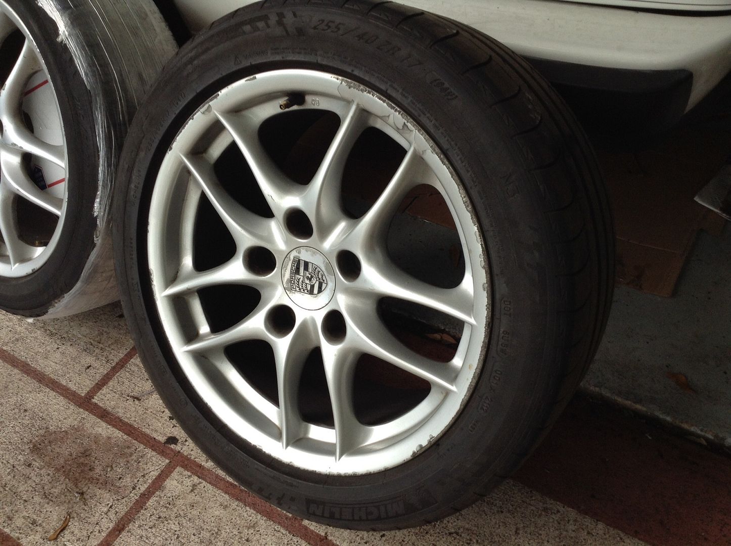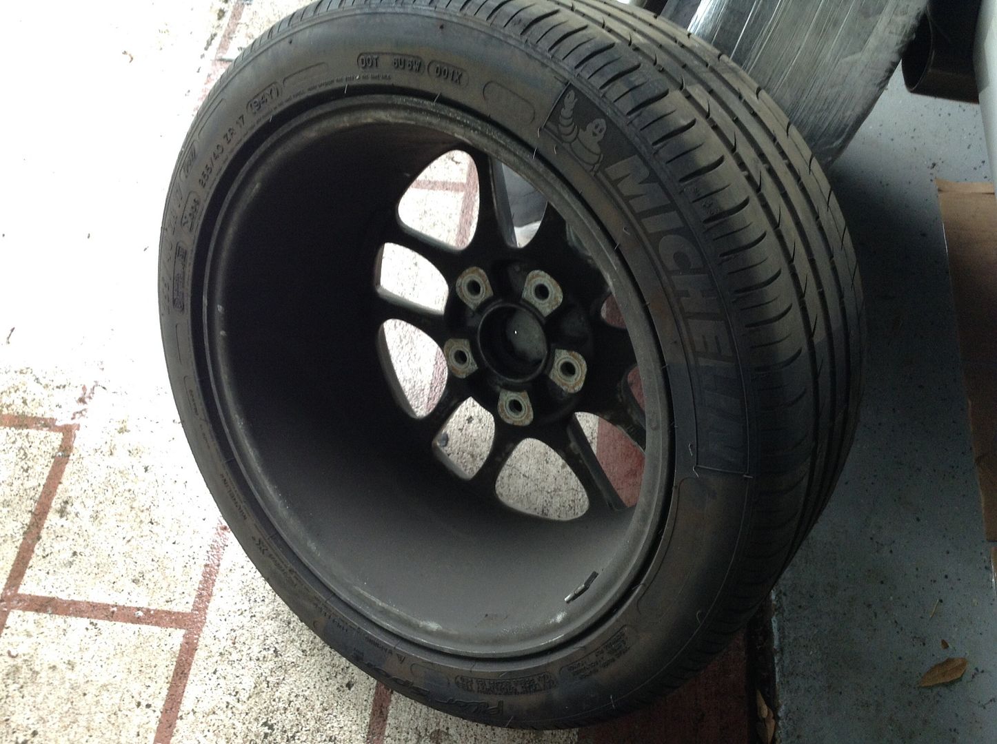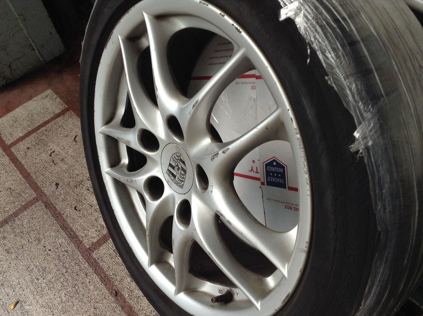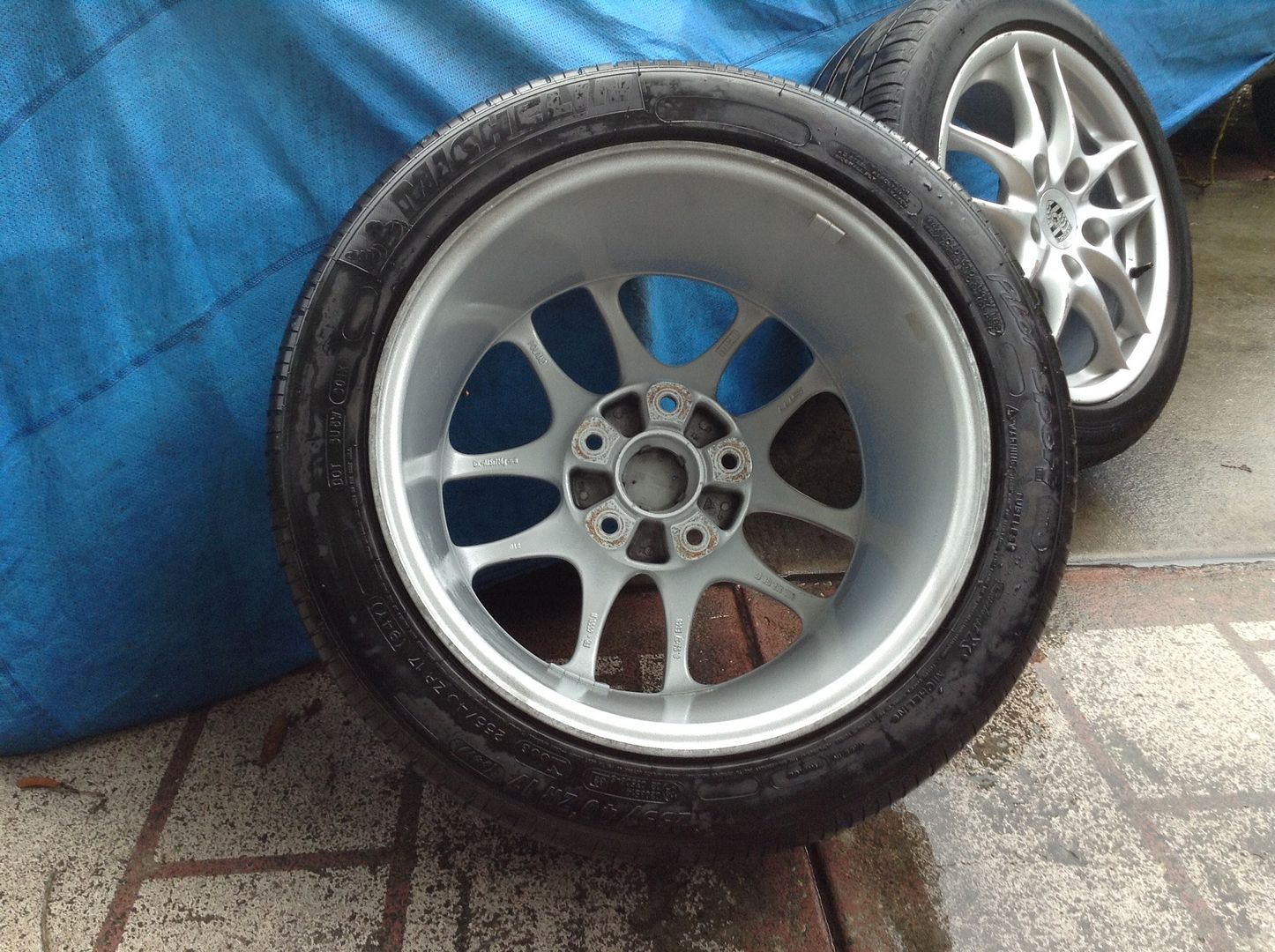 I'm due for new tires in the rear (245/45/16) but unfortunately no one in the US makes that size tire that are street legal anymore. So I thought, I've had these wheels for a while so why not upgrade. Searched around on the web. Found these on ebay, Boxter III wheels, used with Michelin tires. For about $1000, I know I prob overpaid especially in the condition they were in. Well I got them in. Excited. I took me to body to get them redone, they shipped it out to a wheel manufacturer to get them redone. I'm happy with the results. Let me know what u guys think!