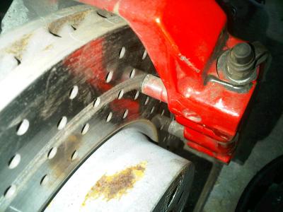As I said, the two lower (towards the center of the rotor) "pins" do not move; they are held in place by small roll pins inserted from the bottom side of the caliper. Their purpose is to hold the bottoms of the pads so they do not try to rotate inside the caliper under braking. When the small roll pin comes out, this is what happens:
