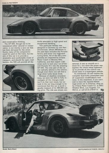 Hey guys I'm getting closer to actually driving this thing. Akers Porsche has been doing some final sorting and then its off to the bodyshop for some touchup and a frt bumper repair/respray. Going to blacken the headlight area and fab up some plexi covers. Question. Is this info on 1000sel.com accurate? 10 Ways to do Porsche 911 tuning "This is a Kremer 935 Street-Turbo (or Kremer 935 Group 5 Street). It looks like a DP Motorsport Porsche because it almost is: Kremer-Porsche was the private Porsche racing team that gave DP's Ekkehard Zimmermann the order to make a new body for the 935 Porsches in the 1970's. This street-version based on a regular Porsche 930 Turbo also used a bodykit similar to the one DP Motorsport street-cars used. Accept for the racy looks with slanted nose and widebody fenders the Kremer 935 Group 5 Street had a 360BHP or 390BHP engine." This white car is the one they are referring to. Looks very close to mine although I have normal flag mirrors: ![]() And some more of mine. I need a gold chain and a hairier chest hahahah! ![]() ![]() ![]() My car on the street going to the 1983 Frankfurt Auto show: ![]() And sometime later in the 80's when it lived in New Mexico next door to Georgia O'Keeffe: