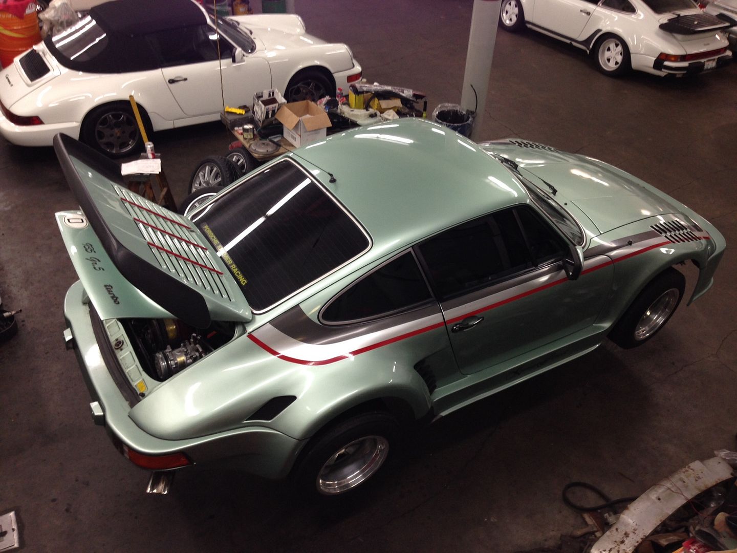 I'm told that the car lived in the Boise, Idaho area for almost all of it's life. About a year ago, a Seattle area collector bought this car and a vintage 'caddy as a package from their aging/elderly owner in order to get the best deal possible on the 'caddy. He meant to flip the 930 Kremer asap and yours truly was the 1st to take the bait for better or worse heh-heh. I have no way to verify if the 39k miles on the odo are accurate. One would have to assume that this is not the original speedo unit since a German market car would be in kilos. All I can say is the overall condition of the car seems to more or less jive with this reading. The engine is very dry and runs well. But who knows or can say for certain. I towed it to a friend's shop last year. We've futzed about with it in our spare time after hours with a beer or 2 mixed in. In summary... ~New rear wheel bearings, all of them. What a bee-yatch! ~Repacked, resealed front hubs. ~New rear discs/pads. Fronts look like new or close to it. ~New braided brake lines, all 4. ~New master cylinder. ~Brake fluid flush. ~New valve cover gaskets and valve lash adjustment. Checked for broken head studs and got lucky whew! ~New (rebuilt) adjustable wur valve from Brian L. ~New fuel pumps. ~New Bosch platinums. ~Fresh Kendall 20/50, new o/f and freshly scrubbed sump screen. ~New oil pressure gauge sending unit. That sucked to change. ~Fresh Swepco in the gearbox. ~New Michelin TB15 tyres from Longstone in UK. $$$ ![]() ~Threw away wheel locks which had no key anyway. Hate those so much! ~Replaced missing front Fuchs centercaps and had them painted to match the rears. Thats happening right now actually. ~New front glass. It was original as far as I could tell and not bad, but I wanted a new one. This car came with an electrically heated front glass when new which is of course nla. I made it my life's mission to come up with something and found an outfit in UK that had a batch made up years ago. I ordered 1 which took months and an obscene amount of $$$ to make it arrive. Its an updated part that has way more wires in the glass and operates on a fraction of the juice as the original. Works like a champ though hah! ~New wiper blades. ~New frunk hold-up struts. ~New electrical portion of the ignition switch installed. The mechanical portion was failing as well so I bought a new one. But in end it made more sense to repair the original one and make fresh new keys so as not to rekey the whole car. Works like new again thanks to the old skool locksmith guy we have in the area. ~Rear wiper delete with the blank off plug from the dealer. Yes I saved the pos in a box lol. ~New Momo Prototipo wheel with 1/2" spacer from our host. The oe unit is ok however the stitching is letting go. Saved it as well, natch. ~Emission exhaust port plugs coming so I can remove the air injection rail. All of the other smog stuff was long gone before my time. Still yet to do is get the horn, turn signals, exterior lights, etc., all sorted out and working proper. Another local guy is going to tackle that for me and then she's off to the bodyman. Good times ![]() ![]() ![]() ![]() ![]() ![]() ![]()