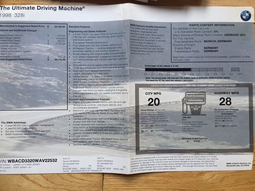 For sale is my 1998 BMW 328i manual transmission sedan that has been properly maintained all its life, by adults. The previous owner and I have used mostly genuine BMW parts to keep it maintained to the highest standard. The car is my daily driver and my family frequently rides in it, so no shortcuts have been taken. The car does get driven so please keep that in mind - it does not sit in the garage and get stared at. I am not going to say "it's a 17 year old car, so don't expect perfection". While that's true, there's a lot of room for interpretation there so let me give you the facts. Clean title in hand 1998 was the last year of the e36 model line 5-speed manual transmission Boston Green Metallic Sand Beige leather interior No aftermarket modifications 1 owner until 208,000 miles -- I have owned it since 2009 and it currently has 242,xxx miles Maintenance records back to day 1, including the original window sticker Maintained at BMW dealers or BMW-specific independent shops Majority of replacement parts were purchased from the BMW factory (i.e. not just OEM) The above reasons were why I purchased the car. I never ran a CarFax on it because of the age of the car and the previous owner told me some panels were repainted due to minor low speed impacts. That did not bother me as the title was/is clean, car was/is straight, and my goal was to develop a solid, great handling, enjoyable and reliable daily driver and the car has been impeccable -- goal achieved. The 6 cylinder inline engine pulls strong and the car handles extremely well with all the factory M3 parts installed (see below). The car is driven year-round, so it is starting to show surface rust on non-structural points, like the bottom of the doors. This is unfortunately common with many BMWs. The hood was repainted last fall to address peeling clear coat and the roof has touch up spots done by the previous owner. The interior is in good shape and the driver's seat has a small tear. Some seams in the upper rear seat back are starting to separate. The car does clean up well as the pictures indicate. Parts replaced under my ownership, mostly as preventative maintenance: - Complete suspension was replaced with factory BMW parts from a M3 (shocks, struts, springs, rear sway bar) - All suspension bushings were replaced with factory BMW parts - either e36 or e46 M3 parts were used where possible - Front control arms were replaced with factory BMW parts -- the whole arm, not just the ball joint - Intermediate steering shaft was replaced with a brand new BMW part -- how often do others do this? - Front tie rods and ends, along with the power steering reservoir - Rear lower control arm, ball joints (all 4 of them with M3 parts), rear trailing arm bushings with factory M3 parts - Oil pan gasket replaced with a factory BMW one - Entire cooling system was replaced -- radiator, hoses, water pump, thermostat, overflow reservoir, front auxiliary fan, etc. - Cooling fan clutch and fan blades replaced with factory BMW parts -- the fan is a Euro Diesel BMW fan that is more durable and pushes more air - Rear brake calipers were completely rebuilt by Goldline Brakes in California - Brake rotors replaced with factory parts -- pads are Mintex - ENTIRE driveshaft (giubo, center support bearing, drive shaft) was replaced with a factory BMW part - $$$ - Front wheel hubs and bearings replaced, as were the rear wheel bearings - Oil pickup tube replaced with a new factory BMW piece that was built for the Z3 since it is reinforced (i.e. stronger) by the factory - Motor and transmission mounts replaced with factory BMW parts - Entire Air Conditioning system was refreshed with new o-rings, a low mileage factory A/C compressor from Turner Motorsports, drier, etc. The system was properly vacuumed and recharged with straight R-134a (no sealers were used -- never) - HVAC blower resistor - Valve cover gasket and spark plugs - All fluids - ABS and Air Conditioner relays - Alternator, windshield and numerous parts replaced by the previous owner Reinforced parts of the car: - While the oil pan was removed to replace the oil pan gasket, I had the mechanic replace the oil pump nut with one that is safety-wired; this addresses a weak point of this otherwise bulletproof motor - Oil pickup tube -- see above section - Front sub-frame motor mount pickup points have reinforcement plates - Rear trailing arm chassis mounting points have reinforcement places welded in - Reinforcing "limiter" plates installed with the rear trailing arm bushings to restrict their movement -- stabilizes the rear suspension in turns - Front strut towers have factory BMW M3 reinforcement plates - Rear shock mounting points have reinforcement plates Asking price of $3600 with the stock wheels and tires (not used since 2011) or $3950 with the lightweight 16 inch BBS RK wheels and Bridgestone RE-760 tires which are currently on the car. The BBS RK wheels are no longer made in the 16 inch size (everyone wants bigger wheels -- not me) and are extremely lightweight and rare. If you are interested in the car, let's talk as I'm open to reasonable offers. Thanks. ![]() ![]() ![]() ![]() ![]() ![]() ![]() ![]()