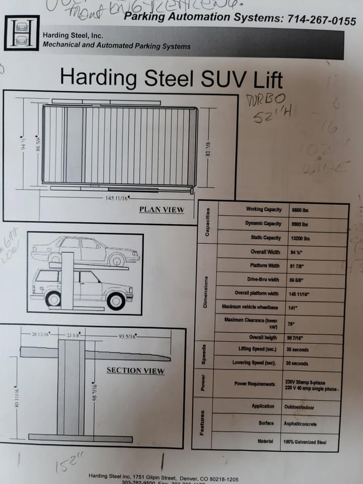 2 post car lift, solid floor with small cut out (custom for a cobra to work on engine). I stored two porsches stacked on it in a low headroom garage Right now since I sold my Porsche, I am just storing parts on it so it really needs to go to someone who can use it. This is made by Harding. They typically were sold to industrial, commercial and high end condo complexes. A lot of people use it to park a car below and stack storage on top. There is a local company that will help move it. I can give you their contact info if you are interested in hiring them to move the lift from my place to yours. High quality high end lift. Here is the website https://www.hardingaps.com Working Capacity 6600#, Overall width 94.25" Platform width 81-7/8" Drive through width" 86.625" Overall platform length 145-11/16" Max vehicle wheelbase 141" Max clearance for lower car: 79" Overall height: 98-7/16" Power requirement: 220V 40A single phase or 220V 30A for 3 phase Indoor or outdoor, all galvanized steel. ![]() ![]() ![]()