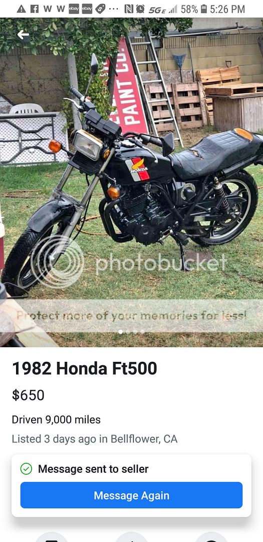 500cc thumper, made only 2 years. Always liked these bikes, probably because I grew up by Ascot Raceway in So Cal and used to go there to watch races and Speedway. Sitting 10 years, gas tank clean, has compression. title on non-op, has side covers (not in pic). Bike is in decent shape, needs a seat cover and some other minor items. Just bought a battery (AGM) for $38 on eBay. Fingers crossed it is a runner. Took it to a buddies who is a motorcycle mechanic for 40+ years. Going to swap some electrical work labor for his bike labor. That way the wife won't see it till it is running. Lol Haven't told her yet. Screenshot from my cellphone.