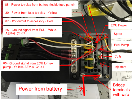 I wired the relay's opposite what the Bussmann DIY noted, with the relays installed right side up. This means that i'm switching using a ground signal, rather than a power signal. DIY Bussmann RTMR Fuse Block, Part 4 – Wiring and Schematics | Bodenzord This is the back of my setup. ![]() The two terminals on the bottom are bridged together and connected to the battery. This provides power to both the fuses and relays (86) The other fuse terminal or "out" is connected to the relay power terminal (30) The 87 terminal provides power to the accessories; ECU, fuel pump, injectors and coils. The 85 is wired to C1-47 of the AEM Infinity 6 ECU. This is the ECU ground switch. The ECU provides a ground to the relay and is the switch. This is used for all accessories, ECU power, coils and injectors. The 85 for the fuel pump is C1-41 of the AEM Infinity 6 ECU. The ECU provides a ground to the relay and is the switch to turn on the fuel pump. This is just what I did. It is not the only way to do it, or the best way. The best way is to buy Rasant's kit with the wiring done. I did not save any money doing it myself, I just choose to because I wanted to learn the system and understand the wiring better for myself. |