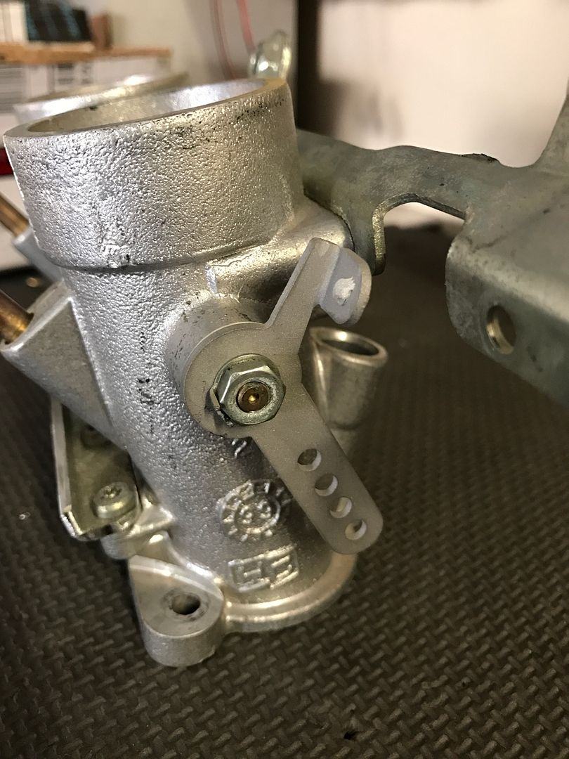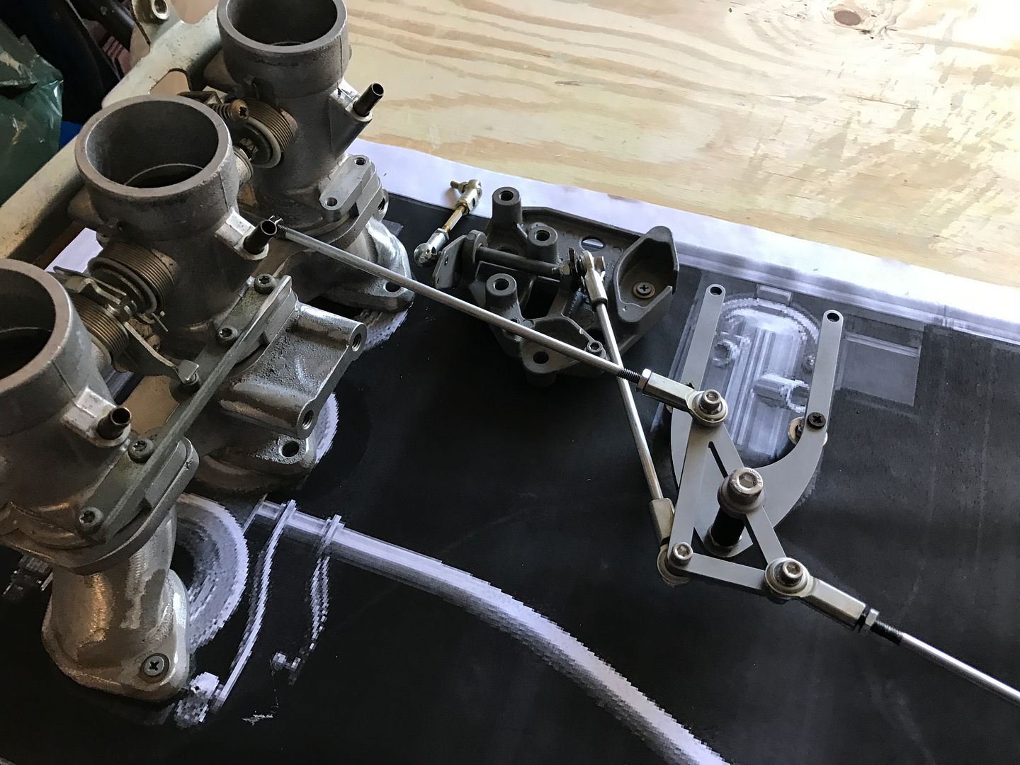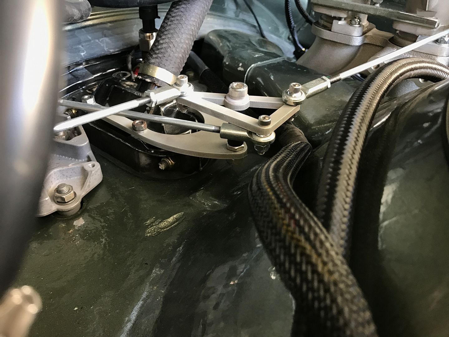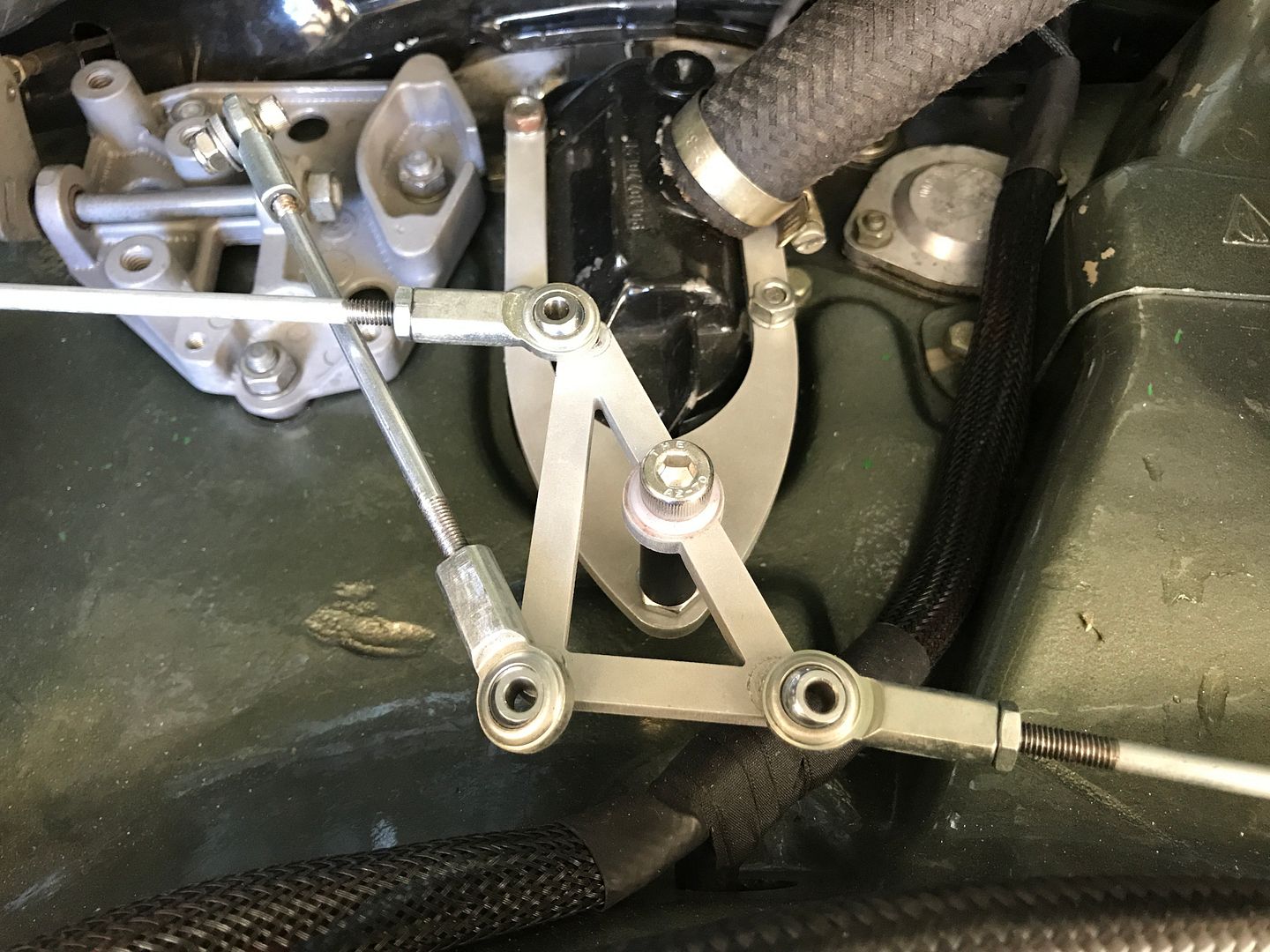 ![]() Reinstall the linkage spring between the new linkage arm and the old one. ![]() ![]() Reinstalled the modified idle stop bracket. ![]() Then the linkage rods are attached to the new linkage arms ![]() For the center pivot I waterjet cut a bracket that attaches to the oil breather and with some hardware and nylon washers provides a base for the linkage to tie into and pivot on. ![]() ![]() Then used linkage rods with swivel ends to connect it all. ![]()
