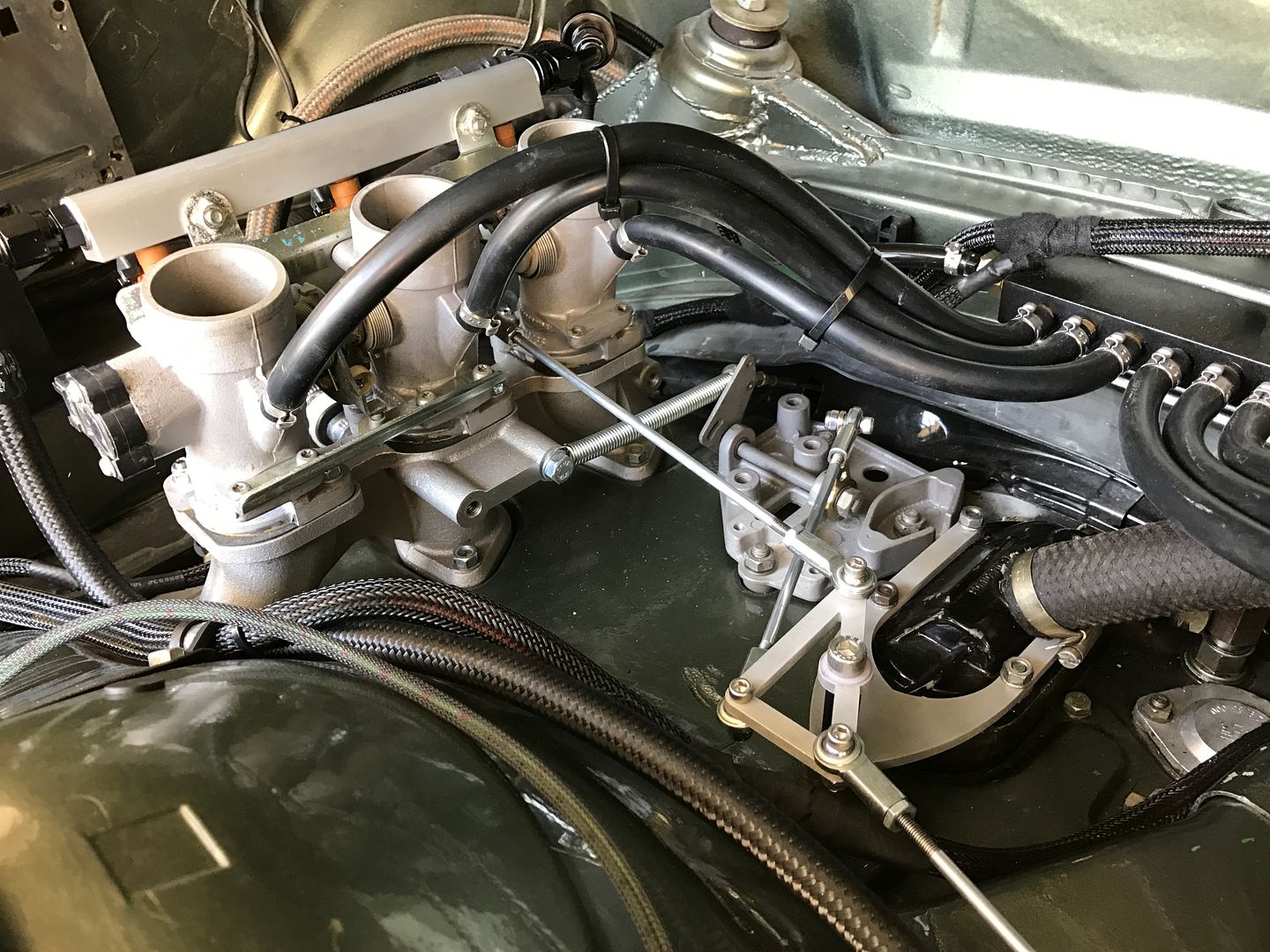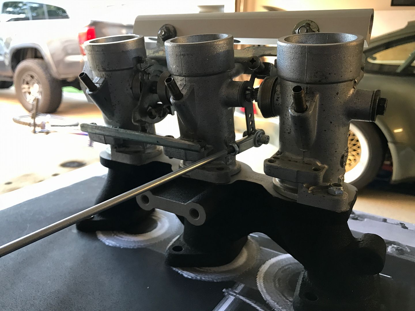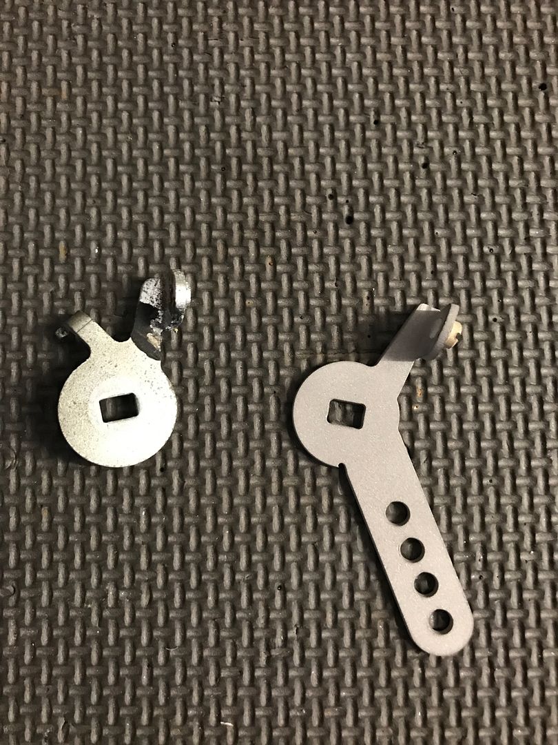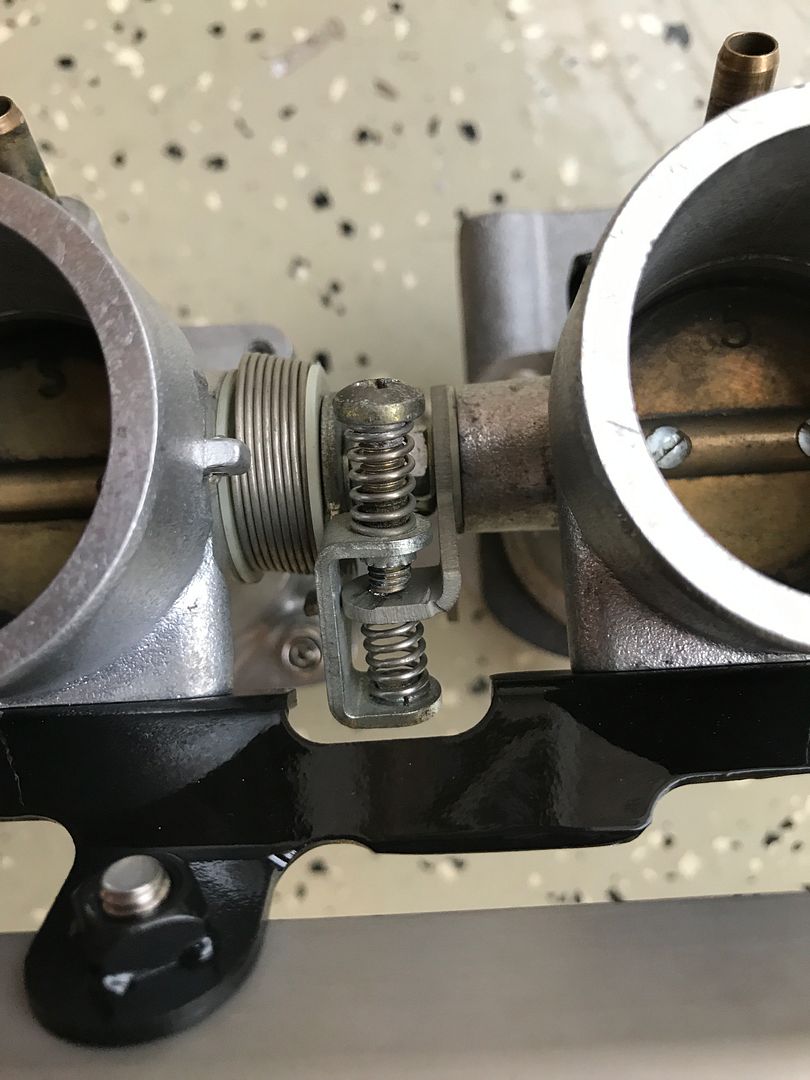 ![]() Reinstall the linkage spring between the new linkage arm and the old one. ![]() ![]() Reinstalled the modified idle stop bracket. ![]() Then the linkage rods are attached to the new linkage arms ![]() For the center pivot I waterjet cut a bracket that attaches to the oil breather and with some hardware and nylon washers provides a base for the linkage to tie into and pivot on. ![]() ![]() Then used linkage rods with swivel ends to connect it all. ![]()