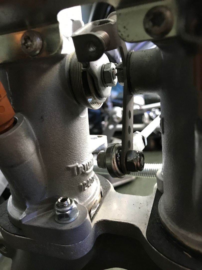 Once the idle is set and everything is balance, the linkage rods can be connected. The length of the two rods should be as even as possible. Adjust by spinning the eyelet on the end when it's loose to the proper length. There should be no change in idle with these connected, there should be a little play before the throttle is engaged.